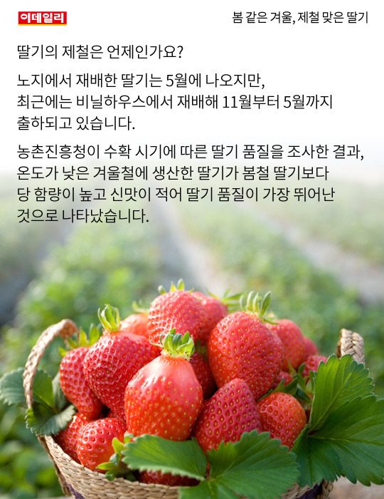 봄이 제철인데 겨울에 생산하는 이유는 딸기가 워낙 과육이 약해서 따뜻한 봄에는 더 잘 물러지고 저장이나 운송하다가 상품성이 떨어지니까 걍 겨울에 출하시키는 거임