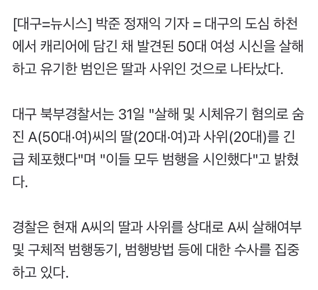[기사]대구 캐리어 50대女 딸·사위가 살해 후 시체유기(종합) 작성자말차초코하임|작성시간26.04.01|조회수1,543 목록 댓글 20 글자크기 작게가 글자크기 크게가 https://naver.me/Gy3jeypH대구 캐리어 50대女 딸·사위가 살해 후 시체유기(종합)박준 정재익 기자 = 대구의 도심 하천에서 캐리어에 담긴 채 발견된 50대 여성 시신을 살해하고 유기한 범인은 딸과 사위인 것으로 나타났다. 대구 북부경찰서는 31일 "살해 및 시체유기 혐의로 n.news.naver.com 다음검색 현재 게시글 추가 기능 열기 북마크 공유하기 신고 센터로 신고 댓글 댓글 20 댓글쓰기 답글쓰기 댓글 리스트 작성자의리야어딨니너없다고기아망 | 작성시간 26.04.01 new 미친.. 작성자밥싸먹는김 | 작성시간 26.04.01 new 남자에 미친년되면 진짜 아무것도 안보이나봐 작성자여자들아행복해 | 작성시간 26.04.01 new ㅁㅊ... 작성자왜안됨 | 작성시간 26.04.01 new 왜 그런거임….. 작성자Develope | 작성시간 26.04.01 new 무슨..... 댓글 전체보기