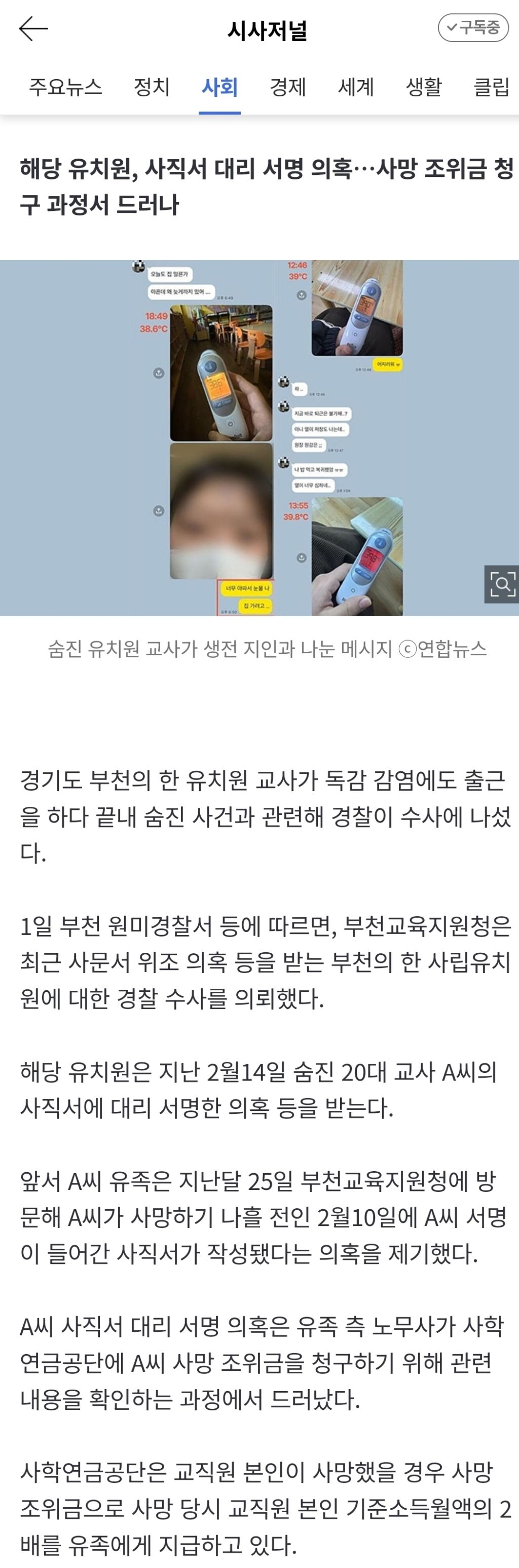 [기사]'독감 출근' 부천 유치원 교사 사망…교육 당국, 경찰 수사 의뢰 작성자대장오리|작성시간26.04.01|조회수385 목록 댓글 3 글자크기 작게가 글자크기 크게가 《 우리 동네 목욕탕 / 대장오리》 https://naver.me/FetTCZJi'독감 출근' 부천 유치원 교사 사망…교육 당국, 경찰 수사 의뢰해당 유치원, 사직서 대리 서명 의혹…사망 조위금 청구 과정서 드러나 경기도 부천의 한 유치원 교사가 독감 감염에도 출근을 하다 끝내 숨진 사건과 관련해 경찰이 수사에 나섰다. 1일 부천 원n.news.naver.com(중략)오리들아 딱 30초만 할애해서 출처가서 후속강추 눌러줘 다음검색 현재 게시글 추가 기능 열기 북마크 공유하기 신고 센터로 신고 댓글 댓글 3 댓글쓰기 답글쓰기 댓글 리스트 작성자여름의 빌라 | 작성시간 26.04.01 new 눌렀슨.. 너무 마음 아프다 작성자엄만 블랙핑크같아 아빠는 그냥 한남 | 작성시간 26.04.01 new 후속강추 눌렀다 어제 뉴스로 보고 나도 기사 퍼오긴 했는데 참.. 그와중에 저런 대처를 했다는게 놀랍더라 작성자늘푸르길 | 작성시간 26.04.01 new 여초 직장일입니다 관심 좀 부탁 댓글 전체보기