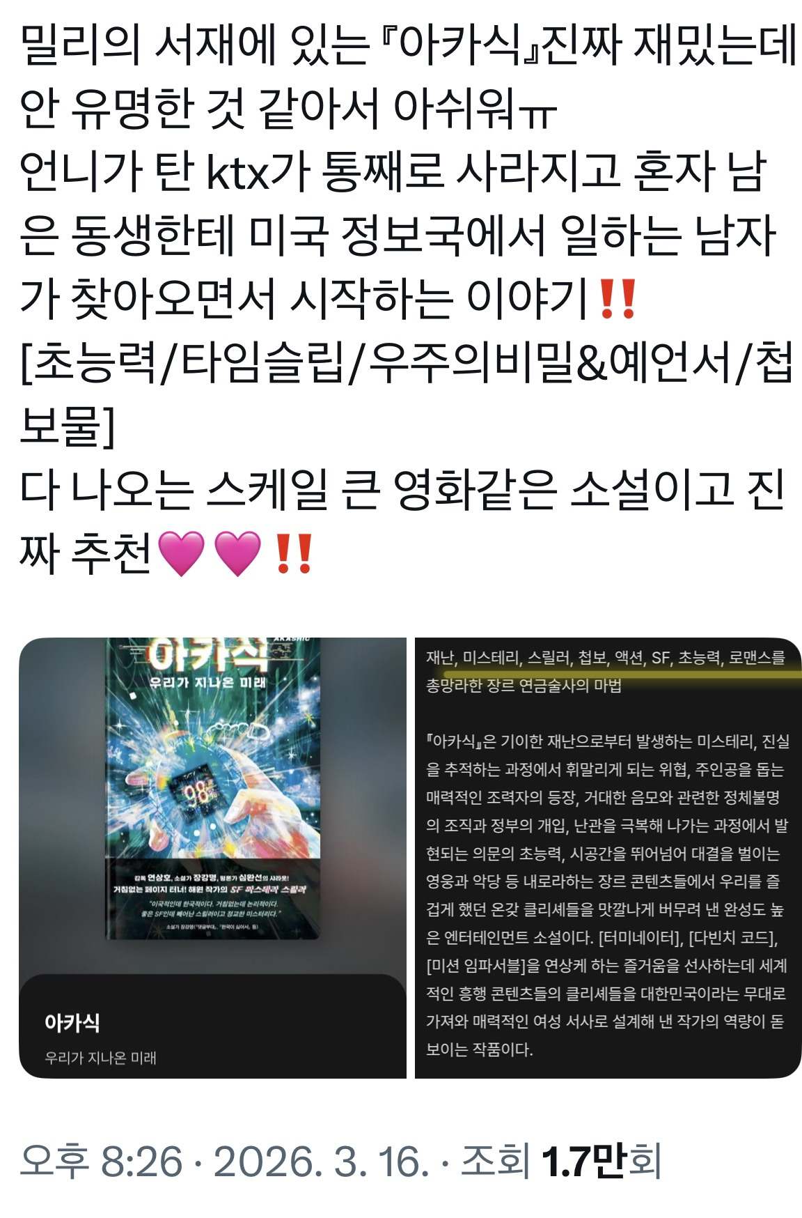 [스크랩] [문학]밀리의서재에 있는 안 유명하지만 재밌는 영화같은 소설. 키워드 #초능력 #타임슬립 #첩보물 작성자파도|작성시간26.04.04|조회수308 목록 댓글 5 글자크기 작게가 글자크기 크게가 아카식저자 해원(슬픈 연대, 굿잡)언니가 탄 ktx가 통째로 사라지고,혼자 남은 동생에게 미국 정보국에서 일하는 남자가 찾아오면서 시작되는 이야기장르 재난, 미스테리, 스릴러, 첩보, 액션, sf, 초능력, 로맨스https://x.com/ppuyam07189/status/2033505111889387733 다음검색 스크랩 원문 : 방석 위로 모여라 현재 게시글 추가 기능 열기 북마크 공유하기 신고 센터로 신고 댓글 댓글 5 댓글쓰기 답글쓰기 댓글 리스트 작성자잼민이조종사 | 작성시간 26.04.04 new 읽어보고싶다 작성자우동탕면 | 작성시간 26.04.04 new 서재에 담아 놨다 봐야지 우동탕에서 추천해준 거 보면 웬만하면 거의 다 재밌더라 잘 볼게 작성자YerinBaek | 작성시간 26.04.04 new 고마워 곧 볼게 작성자실력뒤짐 | 작성시간 26.04.04 new 바로 저장!! 작성자동박새 | 작성시간 02:20 new 오 읽어봐야지. 댓글 전체보기