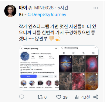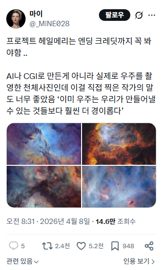 [스크랩] [영화]프로젝트 헤일메리는 엔딩 크레딧까지 꼭 봐야함 .. 작성자침묵|작성시간26.04.08|조회수1,639 목록 댓글 6 글자크기 작게가 글자크기 크게가 출처: https://x.com/_MiNE028/status/2041660139015696583?s=20 다음검색 스크랩 원문 : *여성시대* 차분한 20대들의 알흠다운 공간 현재 게시글 추가 기능 열기 북마크 공유하기 신고 센터로 신고 댓글 댓글 6 댓글쓰기 답글쓰기 댓글 리스트 작성자알콜freee | 작성시간 26.04.08 아름다우면서 무섭다 작성자Delphinium | 작성시간 26.04.08 쿠키 없대서 안보고 나왔는데 아쉽... ott에 뜨면 다시 봐야지... 작성자승협 | 작성시간 26.04.08 2회차에서는 다 보고 나왔잖아 작성자INFP | 작성시간 26.04.08 중간까지 보다 나왔는데 아쉽다 근데진짜 멋졌름 작성자알맹 | 작성시간 26.04.08 맞아 그리고 맨 마지막에 제작사 등 로고도 우주복에 자수놓은 것처럼 떠서 예뻤어 댓글 전체보기