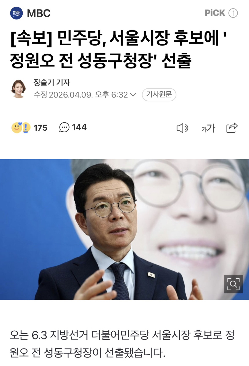 [기사][속보] 민주당, 서울시장 후보에 '정원오 전 성동구청장' 선출 작성자말차초코하임|작성시간26.04.09|조회수633 목록 댓글 20 글자크기 작게가 글자크기 크게가 https://naver.me/Fto8Wn9U[속보] 민주당, 서울시장 후보에 '정원오 전 성동구청장' 선출오는 6.3 지방선거 더불어민주당 서울시장 후보로 정원오 전 성동구청장이 선출됐습니다. 소병훈 선거관리위원장은 "최고 득표자가 과반 득표함에 따라 결선 없이 본경선 결과 따라 최종 후보 n.news.naver.com나이스 ㅊㅋㅊㅋㅊㅋ 다음검색 현재 게시글 추가 기능 열기 북마크 공유하기 신고 센터로 신고 댓글 댓글 20 댓글쓰기 답글쓰기 댓글 리스트 작성자유록 | 작성시간 26.04.09 가든파이브 가보자고 작성자드러눕 | 작성시간 26.04.09 굿 작성자두쬰쿠 | 작성시간 26.04.09 휴 작성자망나니 | 작성시간 26.04.09 다행이다ㅋㅋㅋ 작성자건조대야옹 | 작성시간 26.04.10 new 아 미친 정원오 화이팅 !!!!!!!!!! 댓글 전체보기