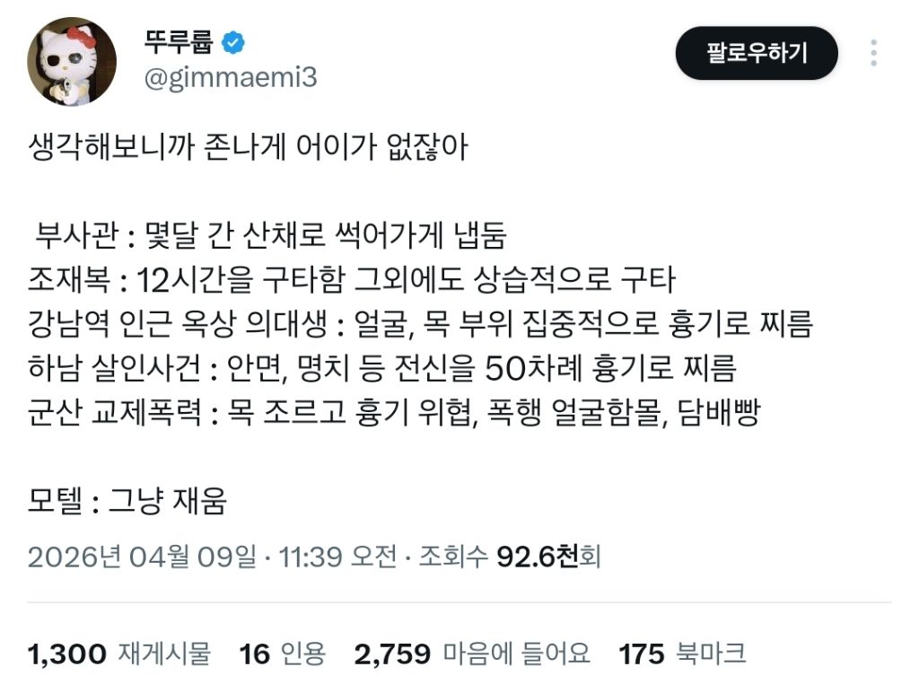 [기타]생각해보니까 존나게 어이가 없잖아 작성자중립화론|작성시간26.04.09|조회수1,726 목록 댓글 18 글자크기 작게가 글자크기 크게가 《 우리 동네 목욕탕 》 https://x.com/i/status/2042069904787173886X의 뚜루륩님(@gimmaemi3)생각해보니까 존나게 어이가 없잖아 부사관 : 몇달 간 산채로 썩어가게 냅둠 조재복 : 12시간을 구타함 그외에도 상습적으로 구타 강남역 인근 옥상 의대생 : 얼굴, 목 부위 집중적으로 흉기로 찌x.com 다음검색 현재 게시글 추가 기능 열기 북마크 공유하기 신고 센터로 신고 댓글 댓글 18 댓글쓰기 답글쓰기 댓글 리스트 작성자여자들아행복해 | 작성시간 26.04.09 ㄹㅇ 작성자매일궁금해 | 작성시간 26.04.09 뭐가 그렇게 억울하냐 개복치들 작성자아바디 | 작성시간 26.04.10 new ㅆㅂ 작성자더이상 상관하지 마세요 | 작성시간 26.04.10 new ㄹㅇ 작성자책읽고 뇌약간 고치기 | 작성시간 26.04.10 new ㄹㅇ 댓글 전체보기