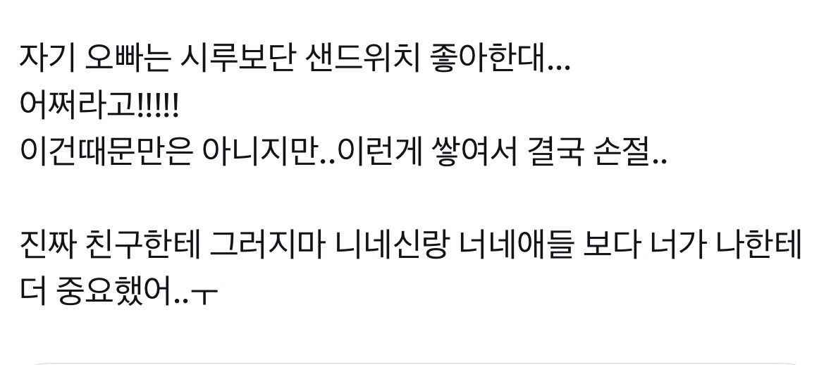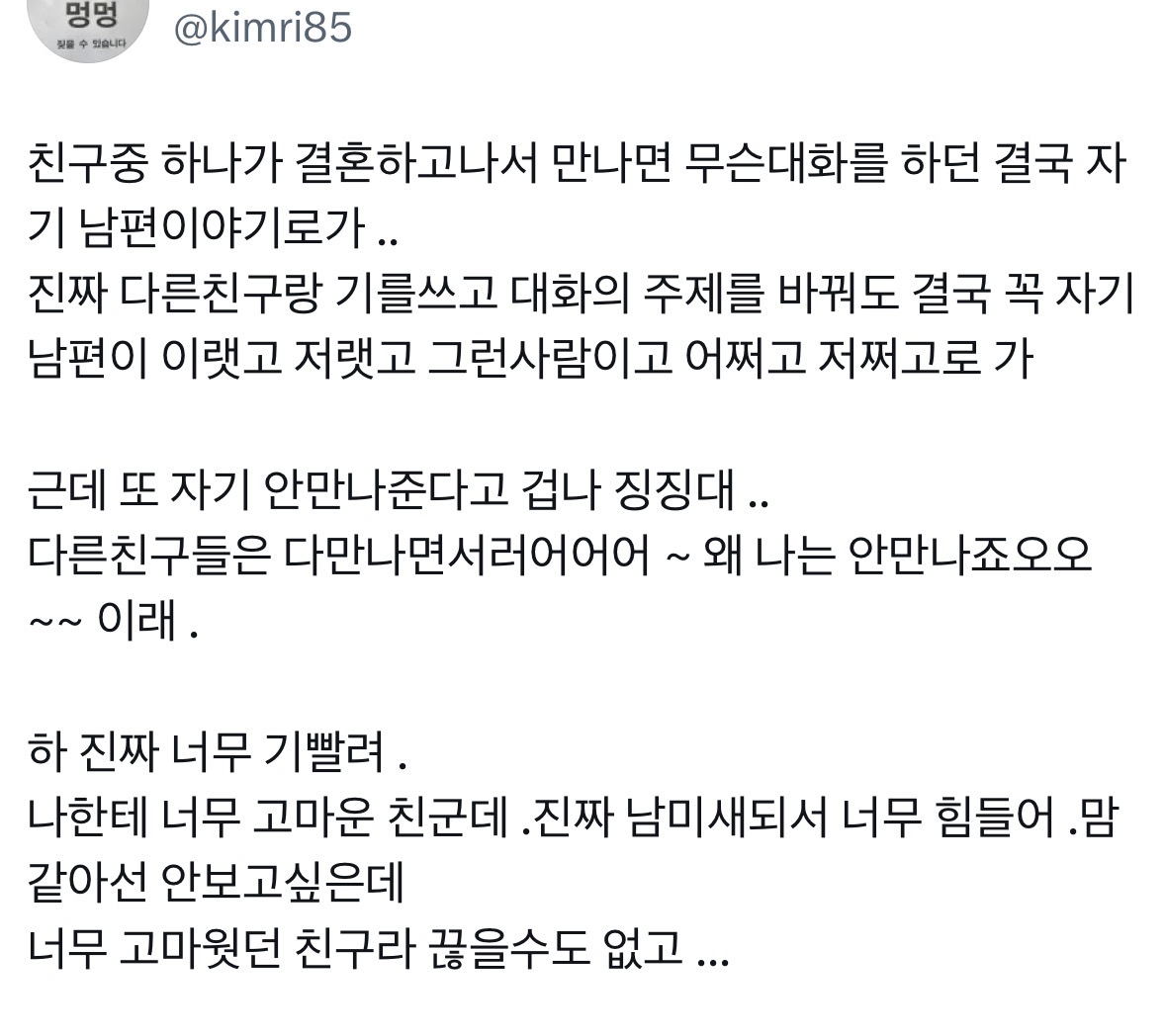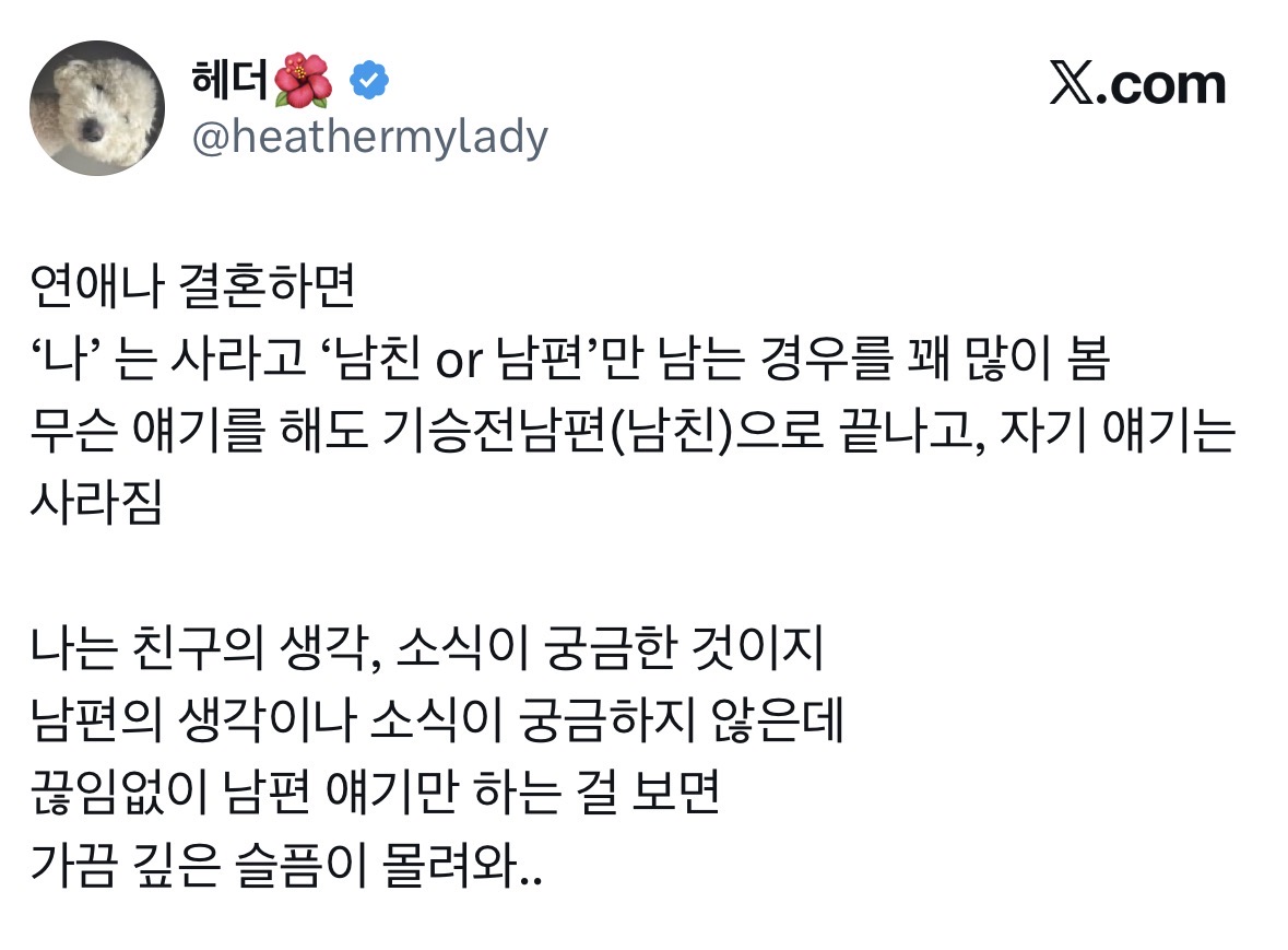 [기타]연애나 결혼하면 ‘나’ 는 사라고 ‘남친 or 남편’만 남는 경우를 꽤 많이 봄 작성자Rumi|작성시간26.04.09|조회수629 목록 댓글 1 글자크기 작게가 글자크기 크게가 https://theqoo.net/square/4157462034 《 우리 동네 목욕탕 / Rumi 》 남자들이 이러는건 잘 못봤는데 여자들은 왜 유독 이러는걸까 다음검색 현재 게시글 추가 기능 열기 북마크 공유하기 신고 센터로 신고 댓글 댓글 1 댓글쓰기 답글쓰기 댓글 리스트 작성자risk | 작성시간 26.04.09 너무 속상해 왜 대체 자아를 여자만 잃는 거임 댓글 전체보기