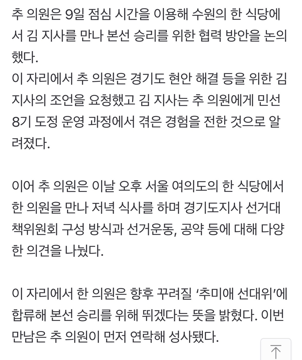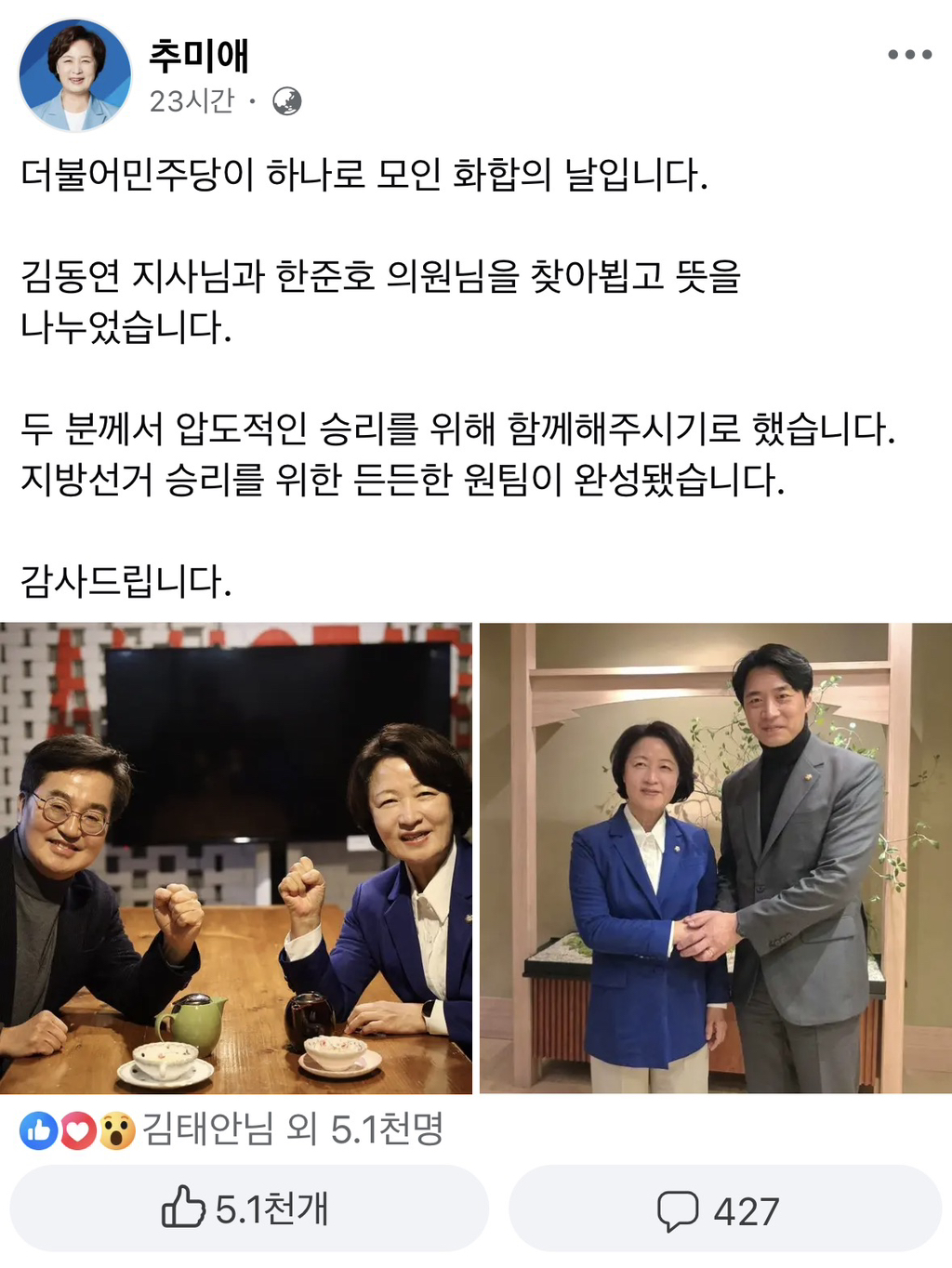 [기사]추미애, 김동연·한준호 회동…6·3 지방선거 원팀 강조 작성자말차초코하임|작성시간26.04.10|조회수203 목록 댓글 6 글자크기 작게가 글자크기 크게가 https://naver.me/G2YUm9Yn추미애, 김동연·한준호 회동…6·3 지방선거 원팀 강조더불어민주당 경기도지사 후보로 선출된 추미애 의원(하남갑)이 당내 경선 경쟁자였던 김동연 경기도지사와 한준호 의원(고양을)을 각각 만나며 6·3지방선거 승리를 위해 ‘원팀 만들기’에 나n.news.naver.com잘 마무리하고 같이 선거 뛰기로 이제 본선거 집중 다음검색 현재 게시글 추가 기능 열기 북마크 공유하기 신고 센터로 신고 댓글 댓글 6 댓글쓰기 답글쓰기 댓글 리스트 작성자스탤론은요? | 작성시간 26.04.10 잘해봅시다 답댓글 작성자스탤론은요? | 작성시간 26.04.10 오늘 보니까 둘이 같이 지하철 타고 다니면서 선거운동 하드만. 작성자깔루아 | 작성시간 26.04.10 그려 잘해봅시다 작성자개나리진달래 | 작성시간 26.04.10 그래 같은 팀끼리 도와야지 그래야 미래가 있는거여 크게 봐야지 작성자지구끝의온실 | 작성시간 26.04.10 화이팅 댓글 전체보기