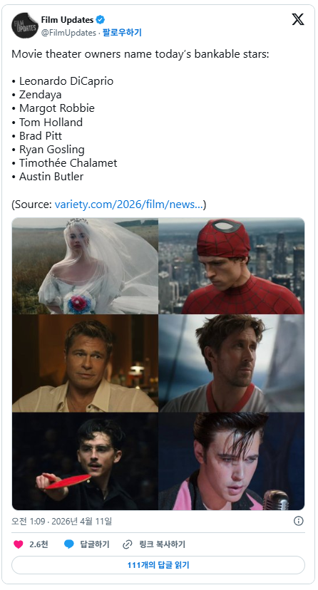 [기타]영화관 사장들이 뽑은 현재 확실한 흥행 스타로 꼽은 배우들 작성자침묵|작성시간26.04.11|조회수10,052 목록 댓글 3 글자크기 작게가 글자크기 크게가 https://www.dmitory.com/hy/407357396 《 우리 동네 목욕탕 / 침묵 》 레오나르도 디카프리오 / 젠데이아 마고 로비 / 톰 홀랜드 브래드 피트 / 라이언 고슬링 티모시 샬라메 / 오스틴 버틀러 다음검색 현재 게시글 추가 기능 열기 북마크 공유하기 신고 센터로 신고 댓글 댓글 3 댓글쓰기 답글쓰기 댓글 리스트 작성자정보없음 | 작성시간 26.04.11 디카프리오 쌉ㅇㅈ 쟤는 무슨 망작이 없어 작성자통역 | 작성시간 26.04.11 다 인정이네 작성자단거 그만먹어 | 작성시간 26.04.11 새삼 레오랑 빵발 ㅈㄴ대단함 나이가 몇갠데 필모 다 좋음 댓글 전체보기