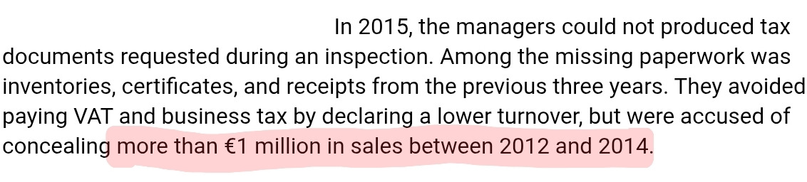 1. 카페 소유주가 탈세함 (3년간 100만 유로 매출 누락 등)