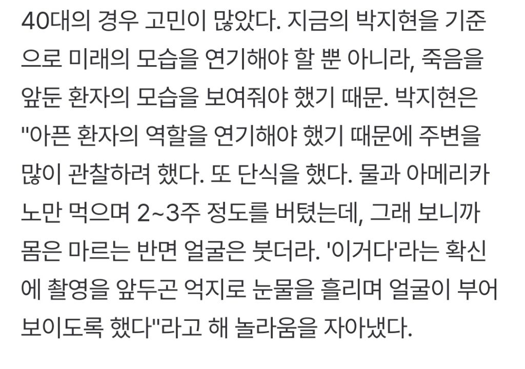 작성자NC다이노스 작성시간 26.04.13 진짜 배우들 대단한거같아 근데 아파보이려고 울고가서 몸은 마르고 아파서 얼굴은 부어보이게했다며
