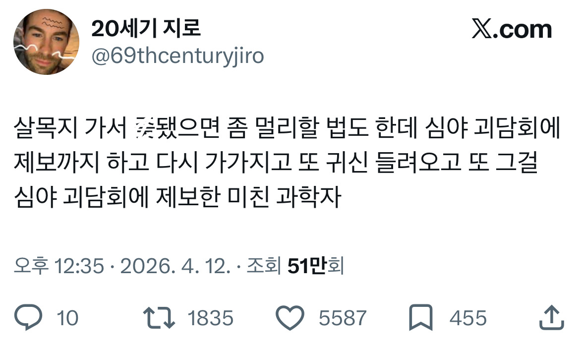 작성자잼킴 작성시간 26.04.14 ㅅㅂ사람들 몰려가는거 언제 안웃기냐ㅋㅋㅋㅋㅋㅋㅋㅋㅋㅋㅋㅋㅋㅋㅋㅋㅋㅋ근데 저 제보자 살목지외에도 이런저런 썰 돌비에 제보했던데 계속 본인이 이과출신,과학자인거 강조하고 썰 자체도 좀 신빙성떨어지는 허무맹랑한 느낌이라 동꼬같은 네임드들처럼 걍 공포이야기꾼..주작느낌 많이남 저기 간 사람들처럼 잼컨으로 즐기면 될듯
