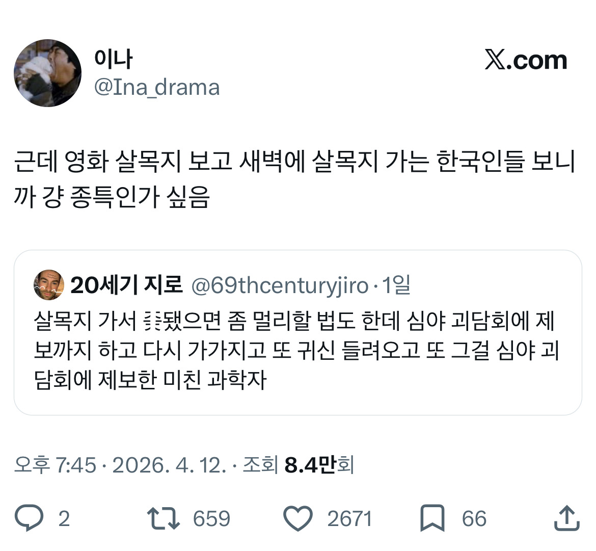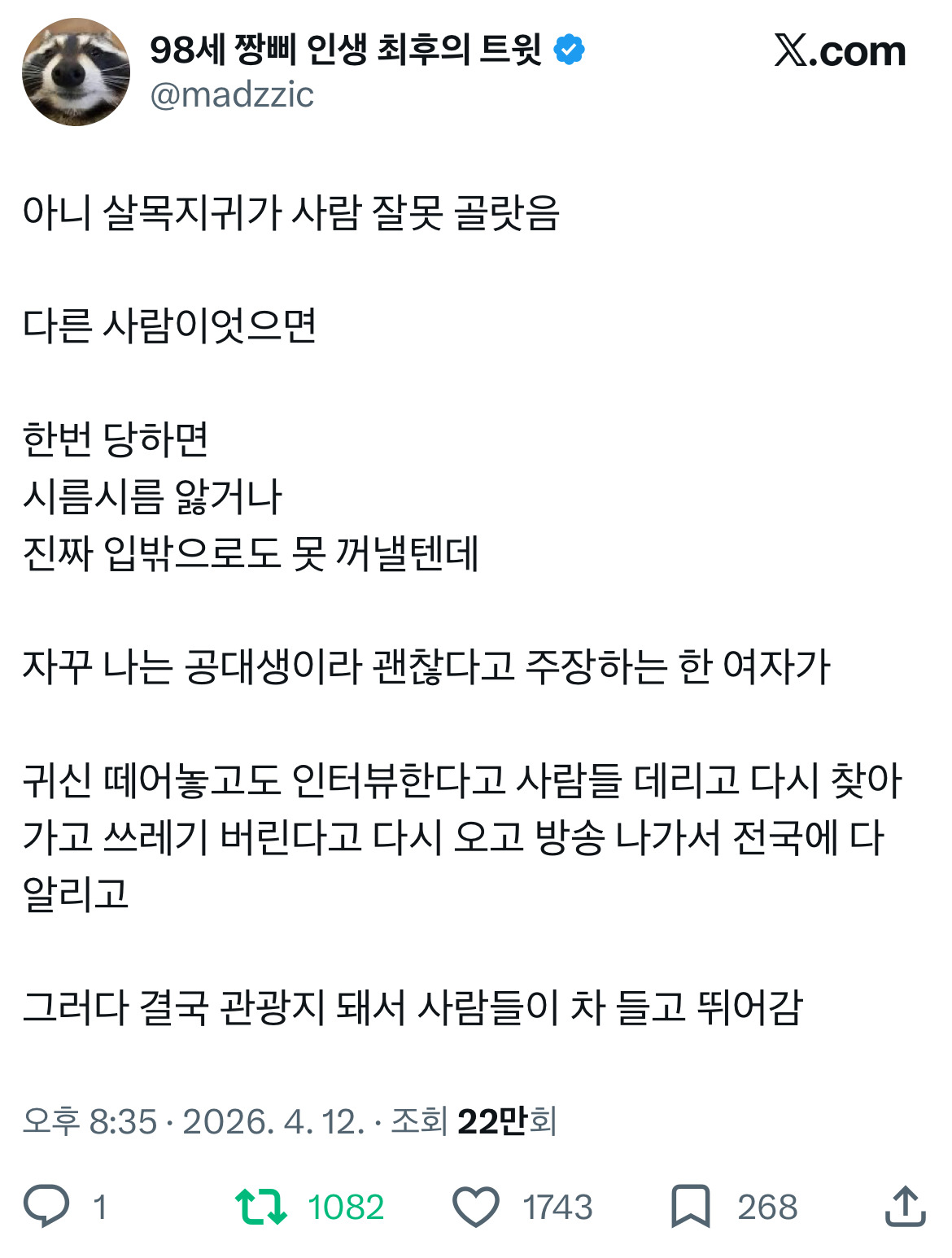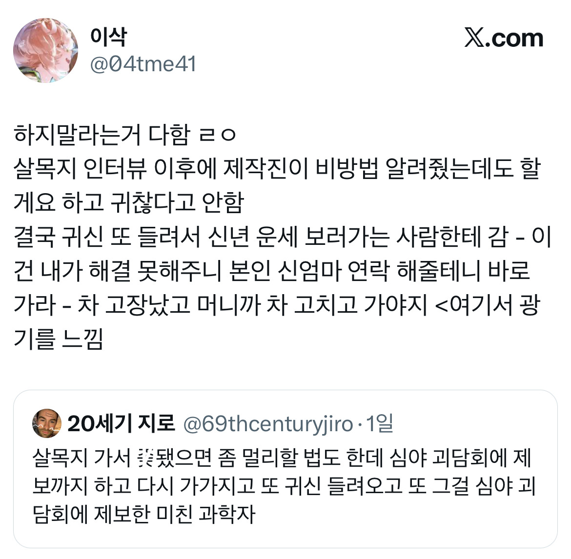 작성자김수한무거북 작성시간 26.04.14 이 제보자 심지어 돌비의 공포라디오에도 몇번 나옴ㅋㅋㅋㅋㅋㅋㅋㅋㅋ살목지 말고도 존1나 희한한 일 많이 겪으셨던데.. 그 사연도 귀신 겪음 -> 무당한테 찾아감 -> 괜찮겠지 -> 더 무서운 일 겪음 -> 다시 무당한테 찾아감 -> 무당이 한숨쉬면서 악귀 다루는 무당한테 사연자 토스함 (독은 독으로 잡아보자는 원리) -> 해결 이런 전개였음.... 독특한 분은 맞는듯해