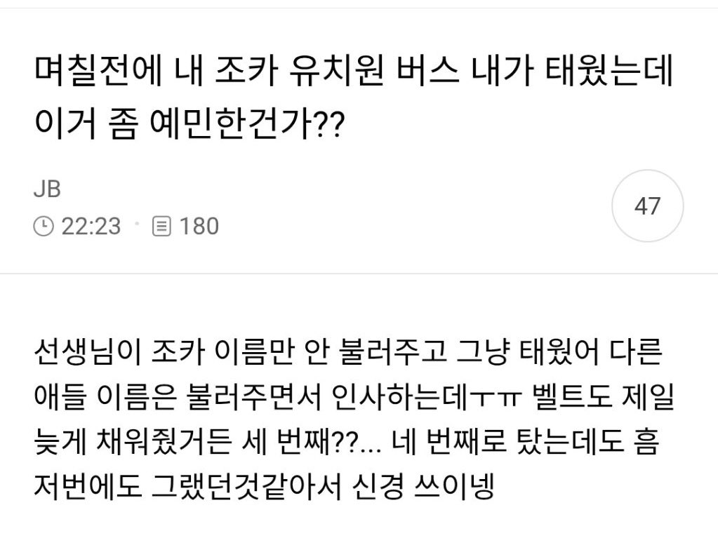 맘카페 안가는 이유 : 헉 우리 유치원선생님음 우리애기 넘넘 이뻐해서 맨날 이름 불러주고 벨트도 젤 먼저 채워주셔 ㅎㅎ ❤️