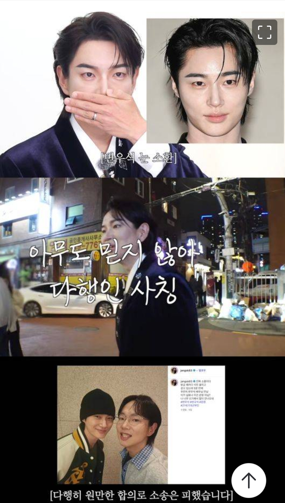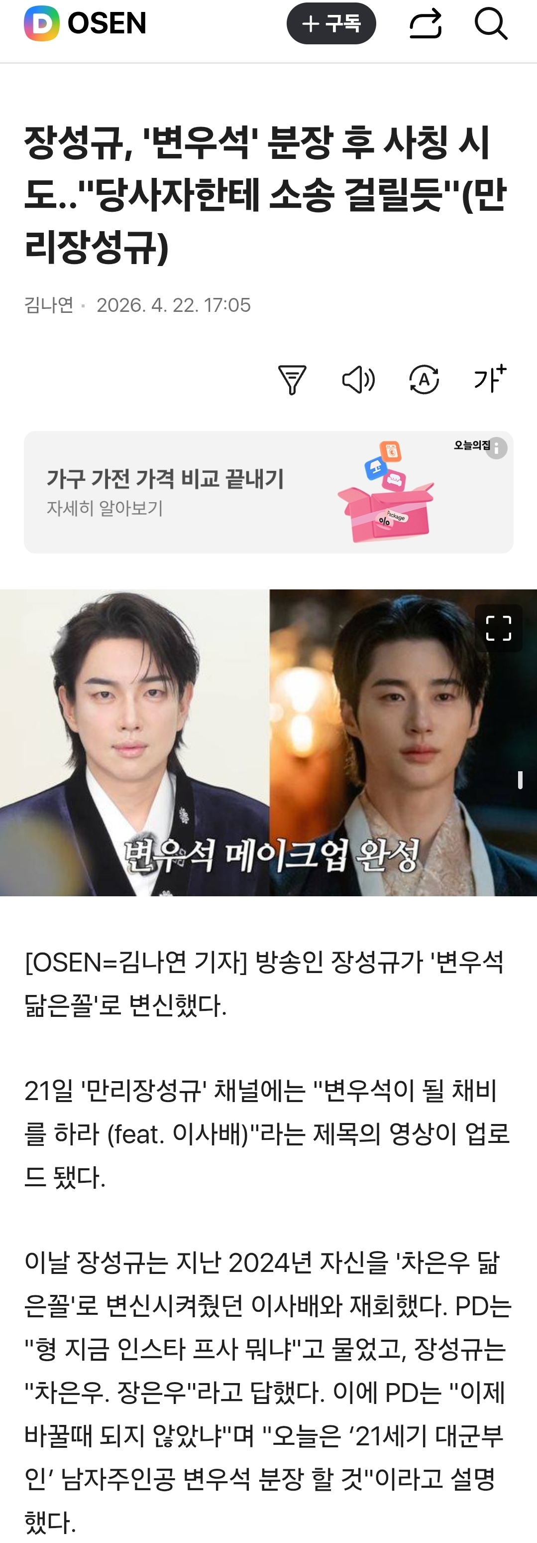 [기사]장성규, '변우석' 분장 후 사칭 시도.."당사자한테 소송 걸릴듯"(만리장성규) 작성자포도맛체리|작성시간26.04.22|조회수2,009 목록 댓글 4 글자크기 작게가 글자크기 크게가 《 우리 동네 목욕탕 / 닉네임 》 https://v.daum.net/v/20260422170502509 다음검색 현재 게시글 추가 기능 열기 북마크 공유하기 신고 센터로 신고 댓글 댓글 4 댓글쓰기 답글쓰기 댓글 리스트 작성자티모 | 작성시간 26.04.22 헐 작성자blossom | 작성시간 26.04.22 닮았다 변우석이 보이는데? 작성자블루블루탱 | 작성시간 26.04.22 웃으면서 들어왔는데 어..? 함ㅋㅋㅋ 특히 눈가린거 ㅋㅋㅋ 작성자이오늘 | 작성시간 26.04.22 와 이사배가 능력자다 댓글 전체보기