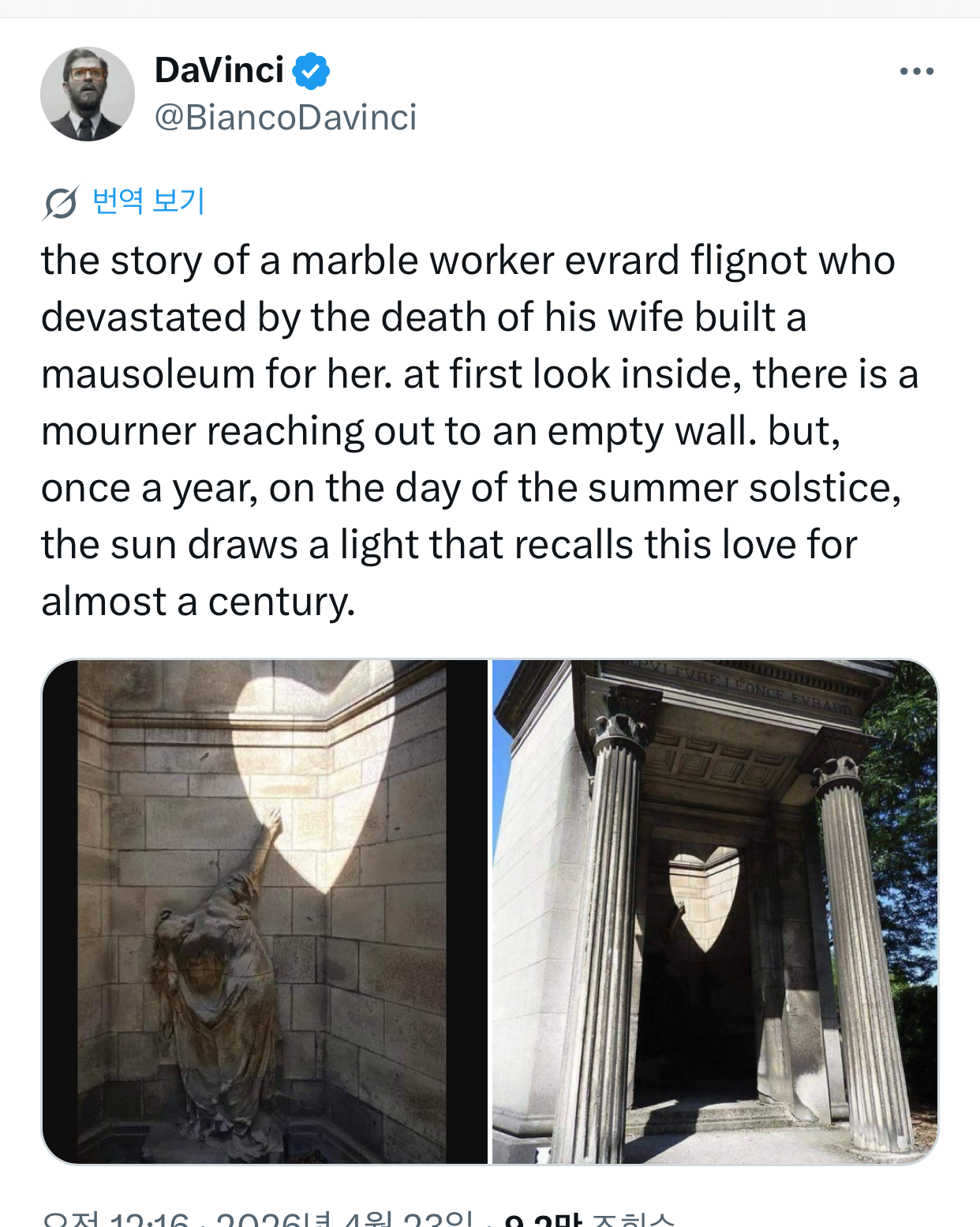 [기타]대리석 세공사가 죽은 아내를 위해 지은 영묘 작성자사과|작성시간26.04.23|조회수1,096 목록 댓글 4 글자크기 작게가 글자크기 크게가 《 우리 동네 목욕탕 / 닉네임 》 https://theqoo.net/square/4174995178매년 하지 정오 무렵에 저런 하트 모양이 만들어진다고본인도 사후 저곳에 묻힘 다음검색 현재 게시글 추가 기능 열기 북마크 공유하기 신고 센터로 신고 댓글 댓글 4 댓글쓰기 답글쓰기 댓글 리스트 작성자무익유해 | 작성시간 26.04.23 사진찍는 핫플될듯남의 묘지에서 찍는 사진 작성자죠리푱 | 작성시간 26.04.23 낭만 작성자올리브사워도우 | 작성시간 26.04.23 와.. 사랑이다 작성자집에가고싶어요 | 작성시간 26.04.23 진짜 사랑이다 저건... 댓글 전체보기
