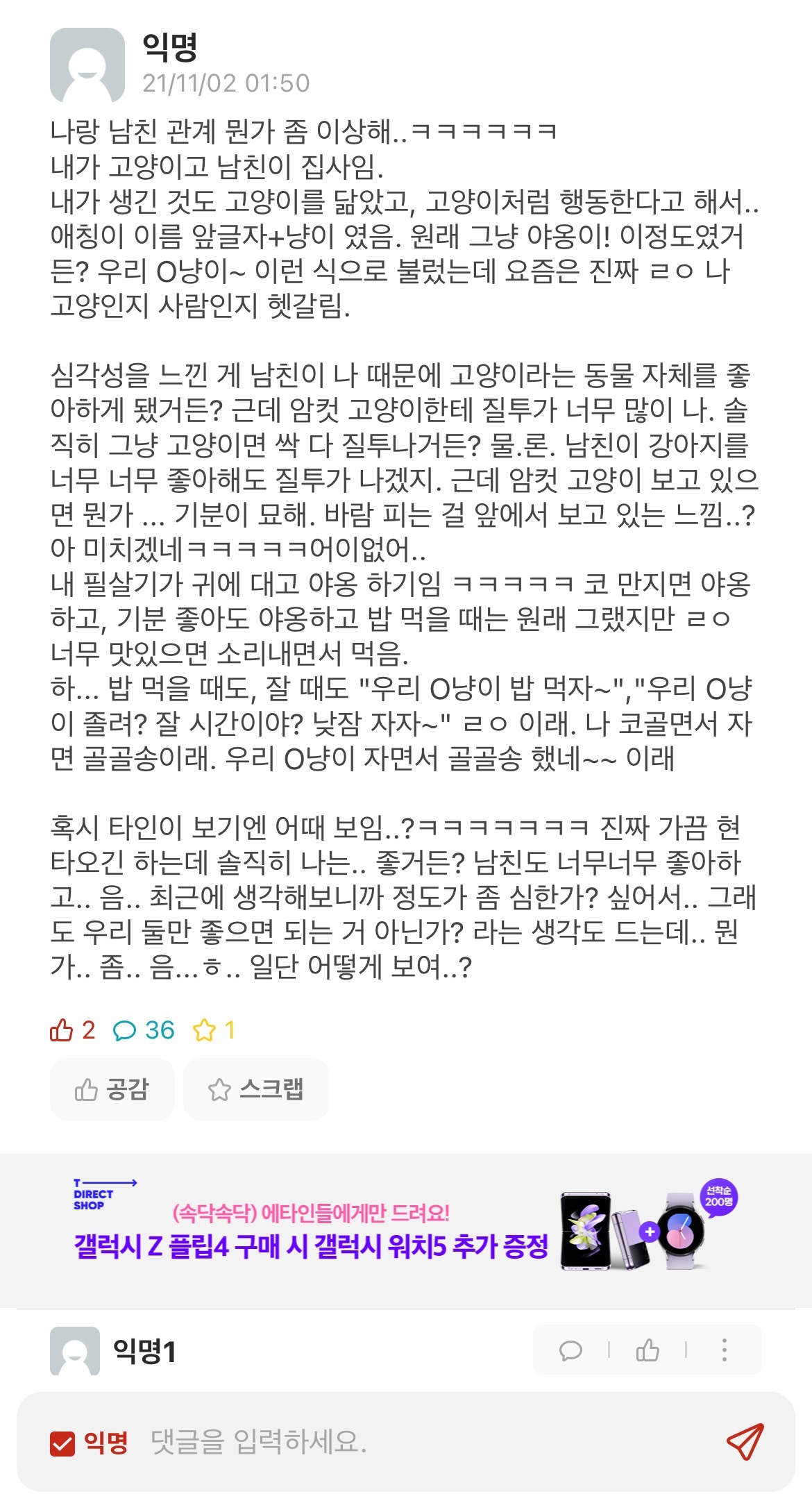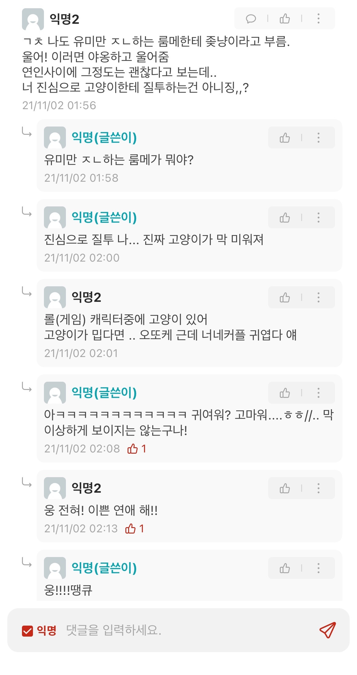[기타]고양이한테 진심으로 질투하는 사람 작성자YESEYESEE|작성시간22.08.18|조회수3,190 목록 댓글 46 글자크기 작게가 글자크기 크게가 하다하다 고양이를 질투하네… 다음검색 현재 게시글 추가 기능 열기 북마크 공유하기 신고 센터로 신고 댓글 댓글 46 댓글쓰기 답글쓰기 댓글 리스트 작성자always awake | 작성시간 22.08.18 징그러.... 작성자xiaxiaxia1215 | 작성시간 22.08.18 우엑 작성자bubblebubble | 작성시간 22.08.18 진지하게 역겹고 괴기함 작성자바람 | 작성시간 22.08.19 와우 작성자더마비바디로션션 | 작성시간 22.08.19 뭔 미친; 댓글 전체보기