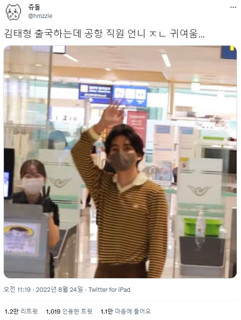 [스크랩] [기타]며칠 전 방탄 뷔 출국 날 화제됐던 일반인.jpg 작성자구르미 그린 달빛|작성시간22.08.26|조회수7,626 목록 댓글 33 글자크기 작게가 글자크기 크게가 출처 : https://twitter.com/hmzzie/status/1562263312573689857?s=21&t=Fqr9QFAEFIXOig0OilLP1g귀여워서 화제☺️✌️ 다음검색 스크랩 원문 : *여성시대* 차분한 20대들의 알흠다운 공간 현재 게시글 추가 기능 열기 북마크 공유하기 신고 센터로 신고 댓글 댓글 33 댓글쓰기 답글쓰기 댓글 리스트 작성자코로나존나아픔걸리지마 | 작성시간 22.08.26 귀 여 워 작성자메리다 | 작성시간 22.08.26 아 ㄱㅇㅇ 작성자운동하는토끼 | 작성시간 22.08.26 저 약간 휘어진 앞머리가 너무 귀여워ㅋㅋㅋㅋㅋㅋ 작성자장폰주궁뎅이 | 작성시간 22.08.27 ㅈㄴ귀여유ㅓ 작성자보람 | 작성시간 22.08.27 ㄱㅇㅇ 댓글 전체보기