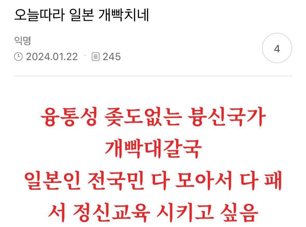 쪽바리들이 드디어 돌았구나 작성자내방최고|작성시간26.01.07|조회수121 목록 댓글 1 글자크기 작게가 글자크기 크게가 검색 허용 해제 필수 외국인란테 밥값 거의 두배 받더니 박물관도 가격 다르게 받는거 검토중이래내가 뒤지기전에 쪽바리가 망하는걸 볼수있겠군 음~ 다음검색 현재 게시글 추가 기능 열기 북마크 공유하기 신고 센터로 신고 댓글 댓글 1 댓글쓰기 답글쓰기 댓글 리스트 작성자눅우세요 | 작성시간 26.01.07 누가가냐 ㅋㅋ 댓글 전체보기