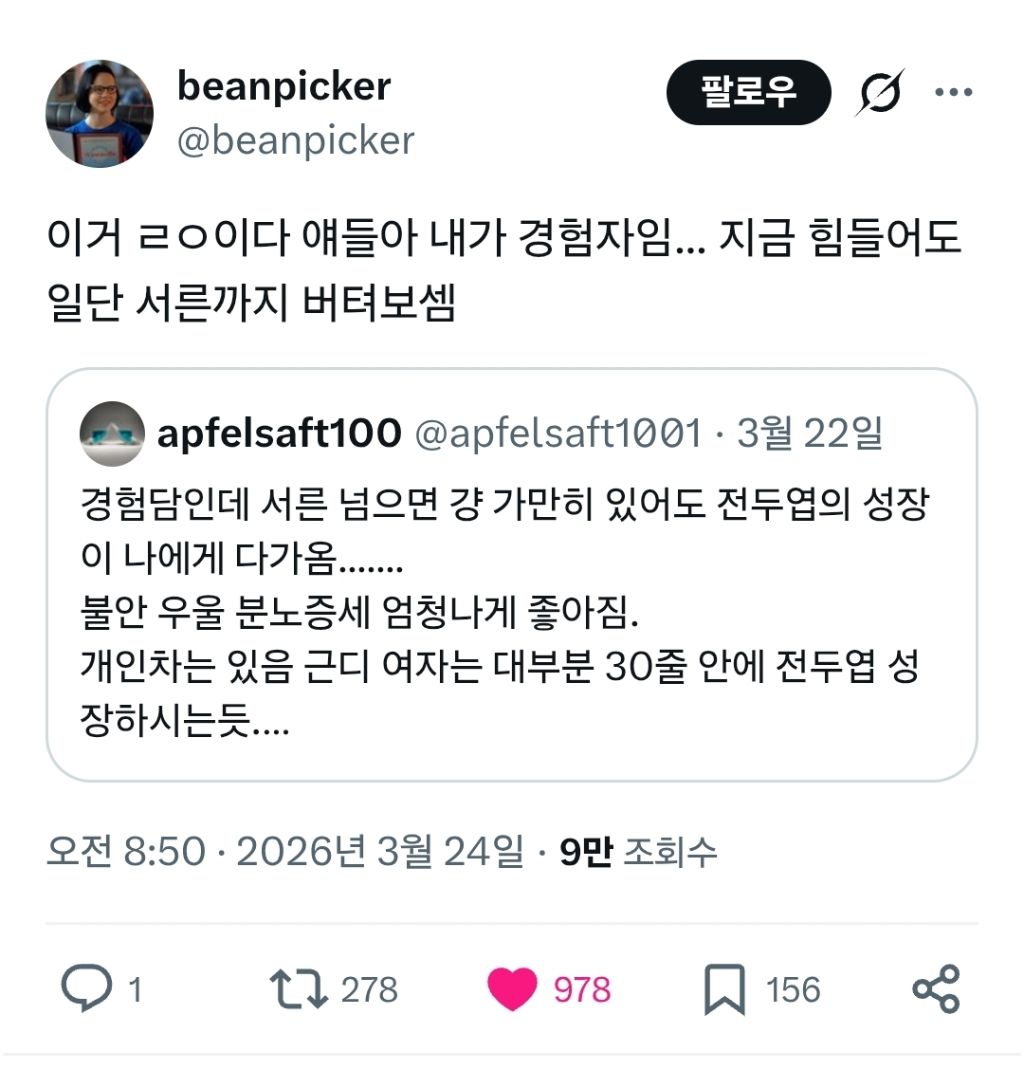 이거ㄹㅇ임 작성자행운가득|작성시간26.03.24|조회수294 목록 댓글 11 글자크기 작게가 글자크기 크게가 출처 : 다음 카페 우리 동네 목욕탕우울증 오리들 좀만 버텨보시게 다음검색 현재 게시글 추가 기능 열기 북마크 공유하기 신고 센터로 신고 댓글 댓글 11 댓글쓰기 답글쓰기 댓글 리스트 답댓글 작성자행운가득 작성자 본인 여부 작성자 | 작성시간 26.03.24 new 버텨봐봐 곧 나아질꺼야 작성자한 낮 | 작성시간 26.03.24 new 서른넘은지 한참인데 잘 몰겠는데.. 답댓글 작성자여기어때 | 작성시간 26.03.24 new 22 답댓글 작성자신망뭉 | 작성시간 26.03.24 new 33 작성자이부 | 작성시간 26.03.24 new 진짜였으면 좋겠다 ㅈㅂ 댓글 전체보기