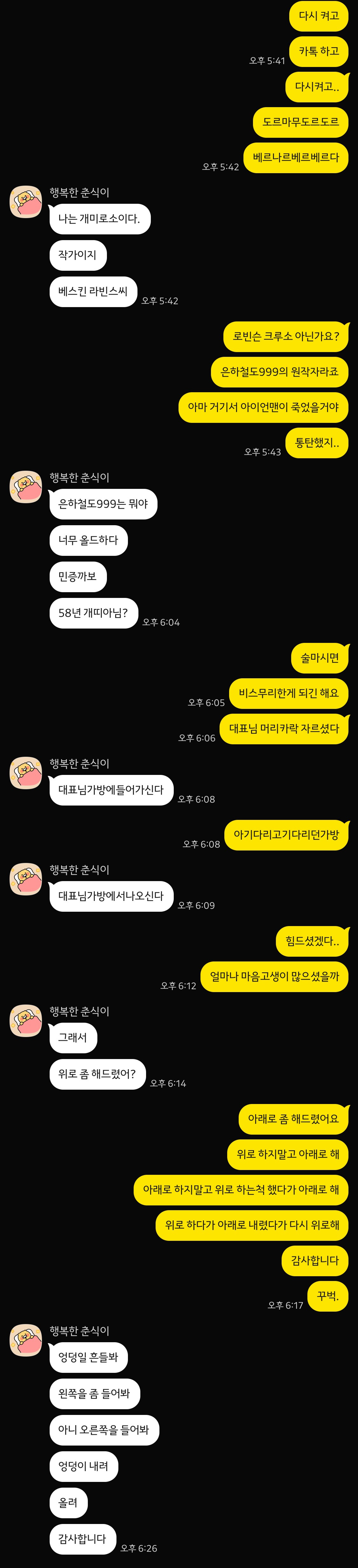 회사에 친한사람 한명 있는데.. 맨날 이따위 대화만 함 작성자김탱구|작성시간26.03.28|조회수316 목록 댓글 8 글자크기 작게가 글자크기 크게가 출처 : 다음 카페 우리 동네 목욕탕뇌빼고 대화함..ㅋ 다음검색 현재 게시글 추가 기능 열기 북마크 공유하기 신고 센터로 신고 댓글 댓글 8 댓글쓰기 답글쓰기 댓글 리스트 작성자따뜻한 파인애플 | 작성시간 26.03.28 new 개웃겨 ㅋㅋㅋㅋㅋㅋㅋㅋㅋ진짜 뇌없이 걍 의식의 흐름 작성자하늘이시여 | 작성시간 26.03.28 new 아 진짜 힘들럿나봐 개웃기다 ㅋㅋㅋㅋㅋ 작성자INTP-T | 작성시간 26.03.28 new 아개웃겨 작성자잼쥐김밥 | 작성시간 26.03.28 new 어떻게 저렇게 잘맞아 ㅋㅋㅋㅋㅋ아 아래로 해 에서 개터짐 작성자흑백요리자 | 작성시간 26.03.28 new 쿵짝 잘맞는다 ㅋㅋㅋㅋㅋㅋ 댓글 전체보기
