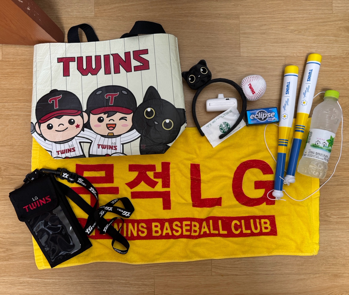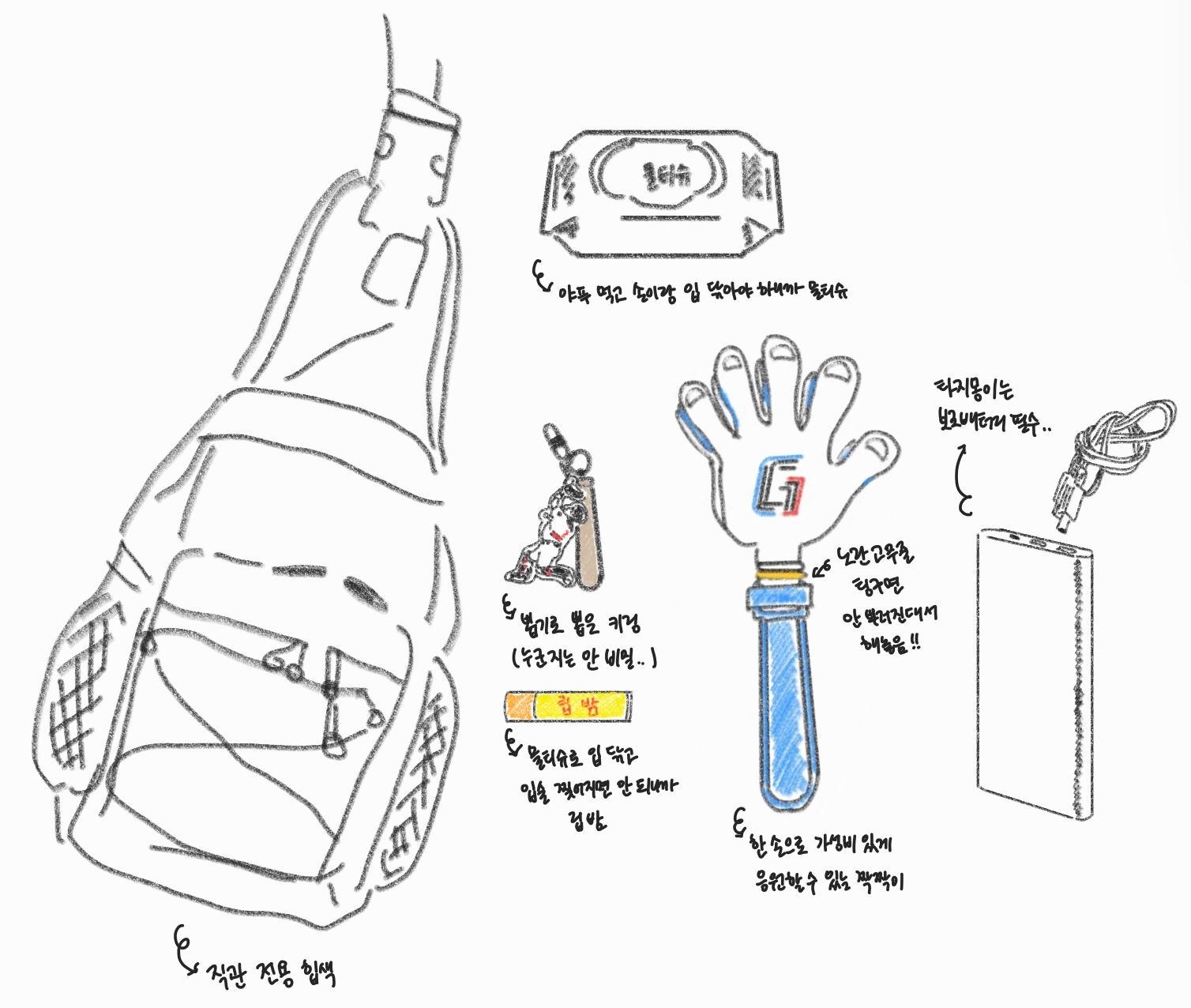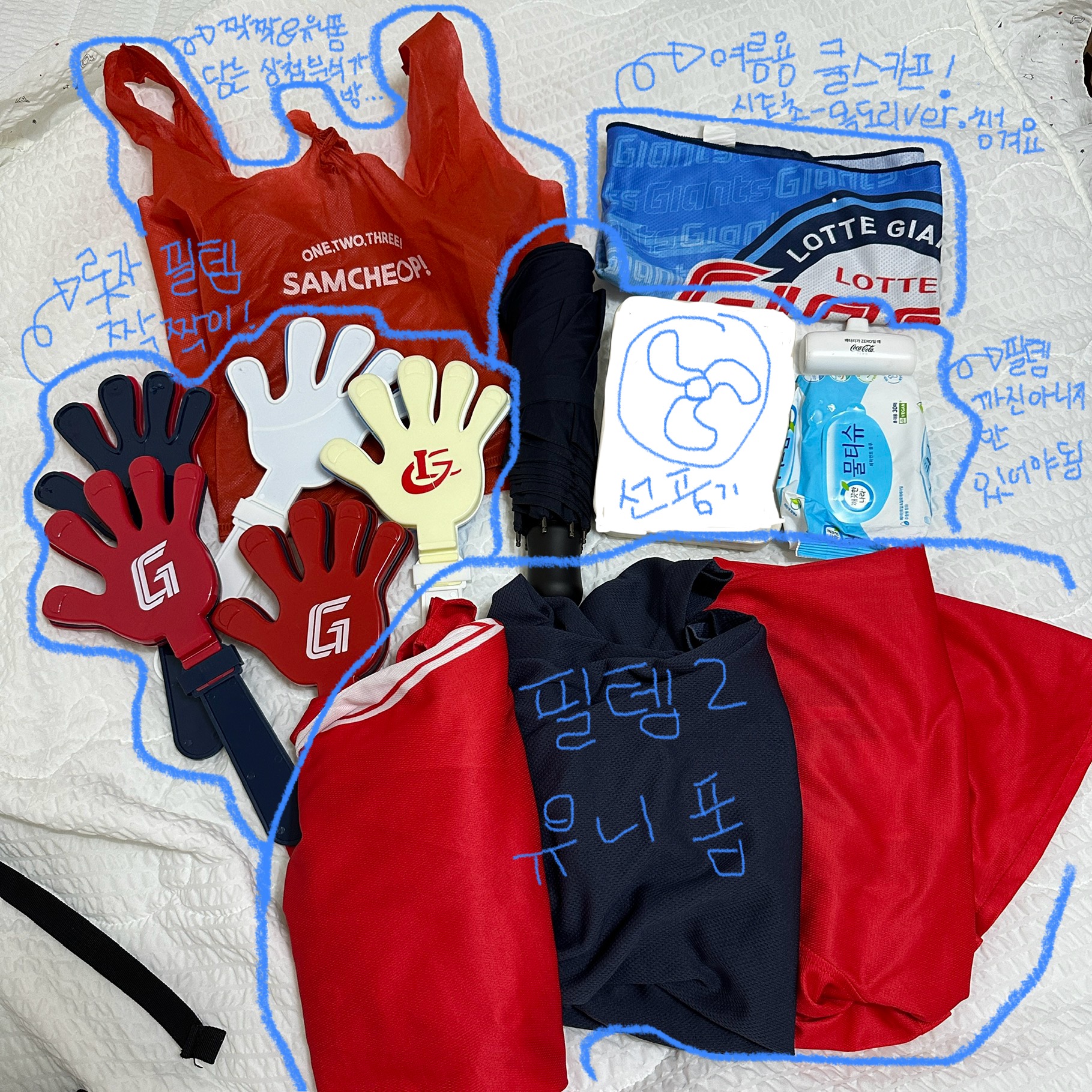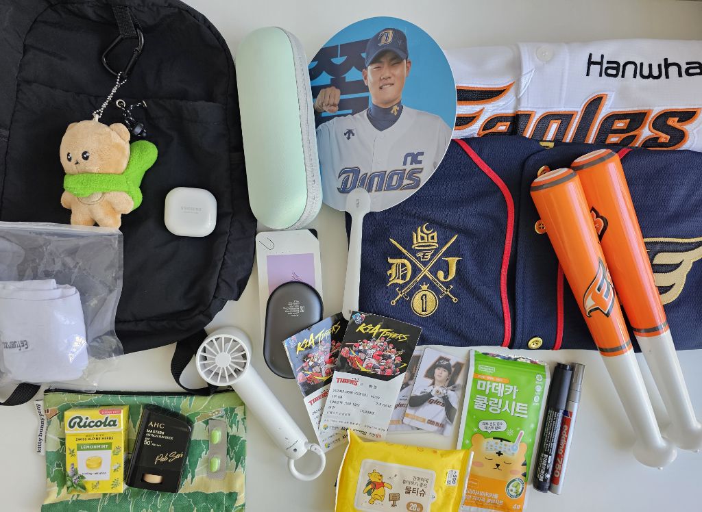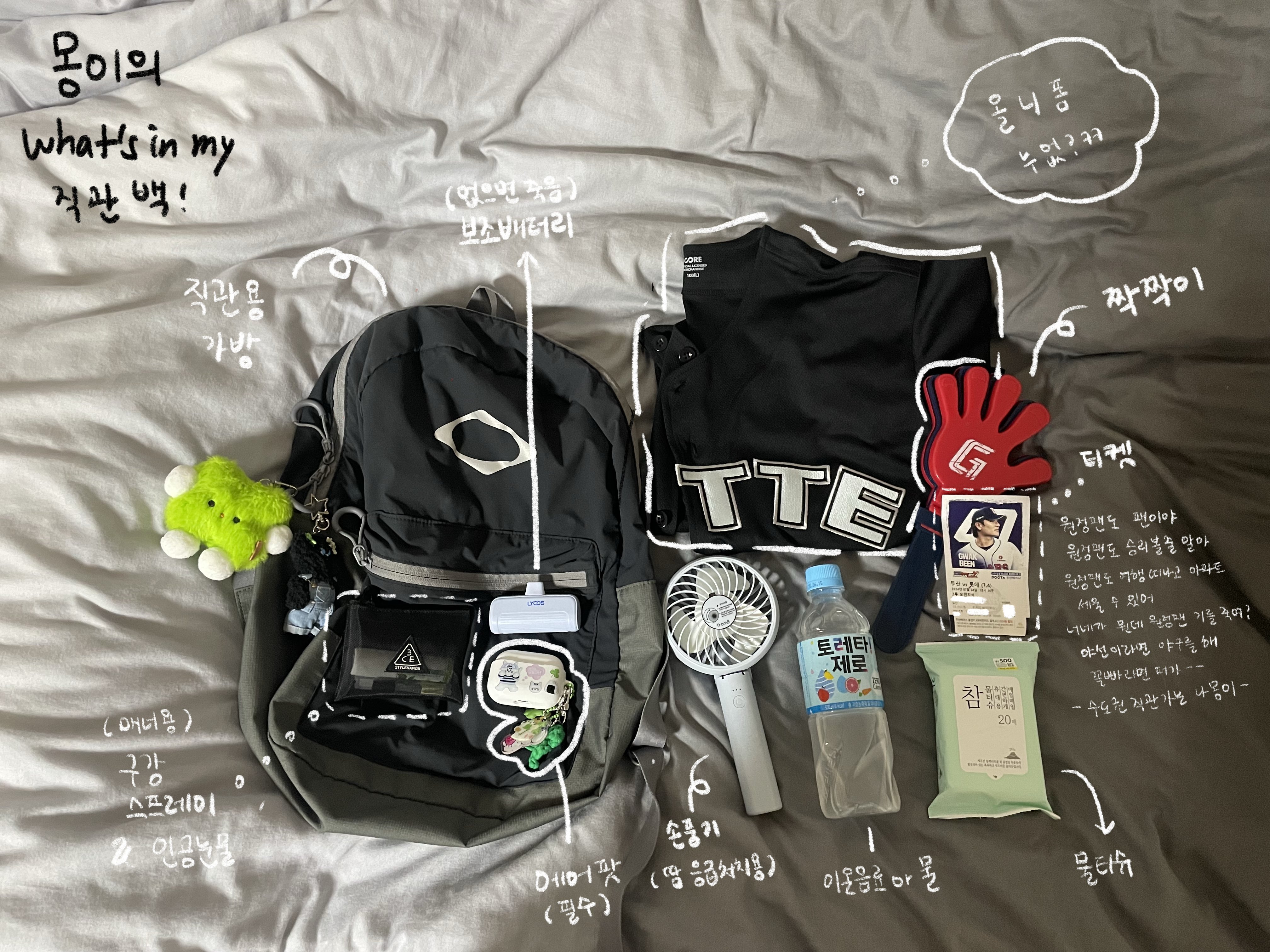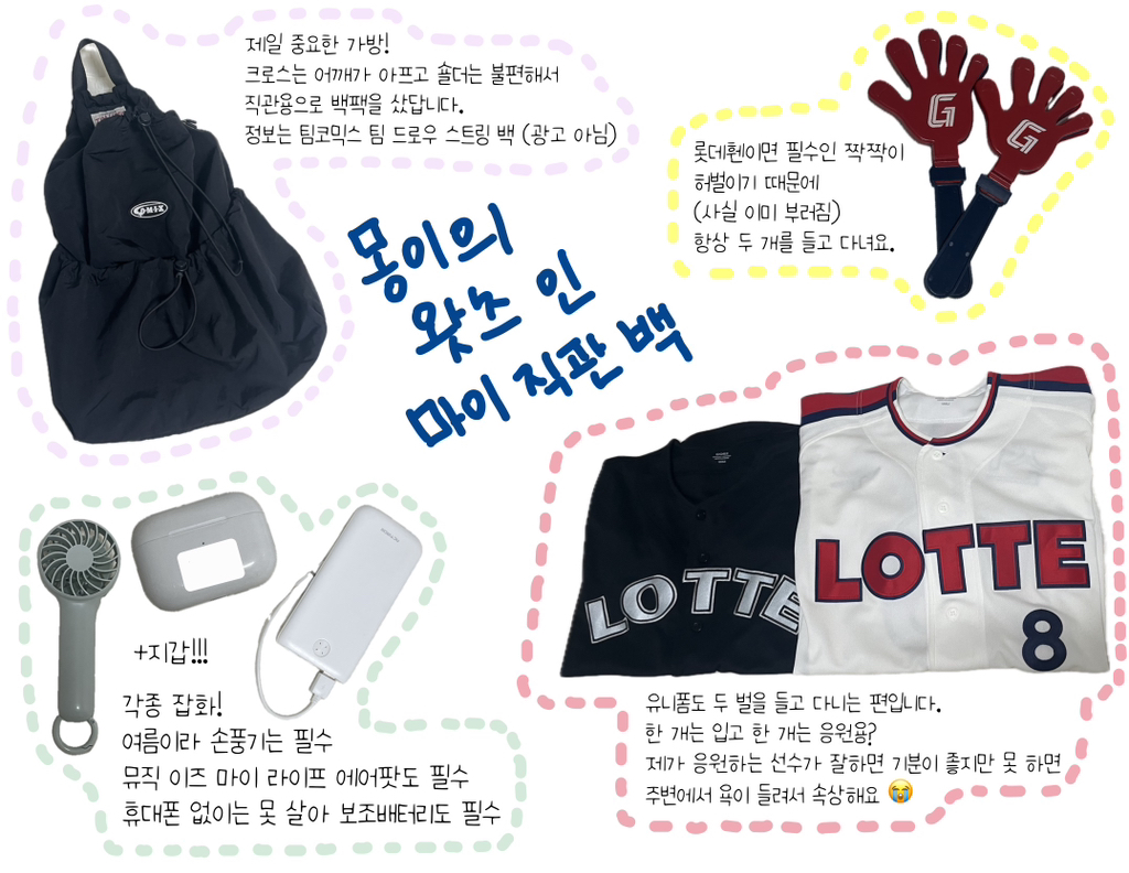 단 필수인 유니폼이랑 짝짝이를 챙기고 tmi로 유니폼 마킹은 제가 전자몽이기 때문에 전준우 선수 했어요. 사직가는 길에 노래가 없으면 안되서 이어폰이랑 무선 배터리를 꼭 챙겨요. 비상용 휴지랑 립밤, 요즘은 덥길래 방글이들 추천으로 손풍기도 들고 다녀요. 저 노란 파우치는 지갑 겸 작은 물건 넣는 용이고 거기에 달린 키링은 랜덤으로 뽑은 겁니다. 제가 고른거 아니예요.