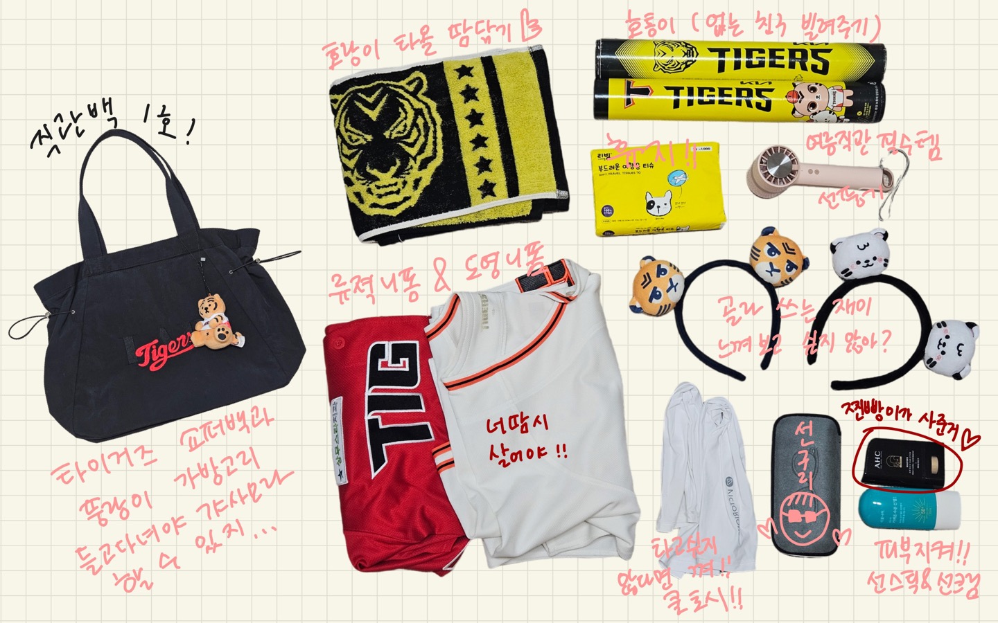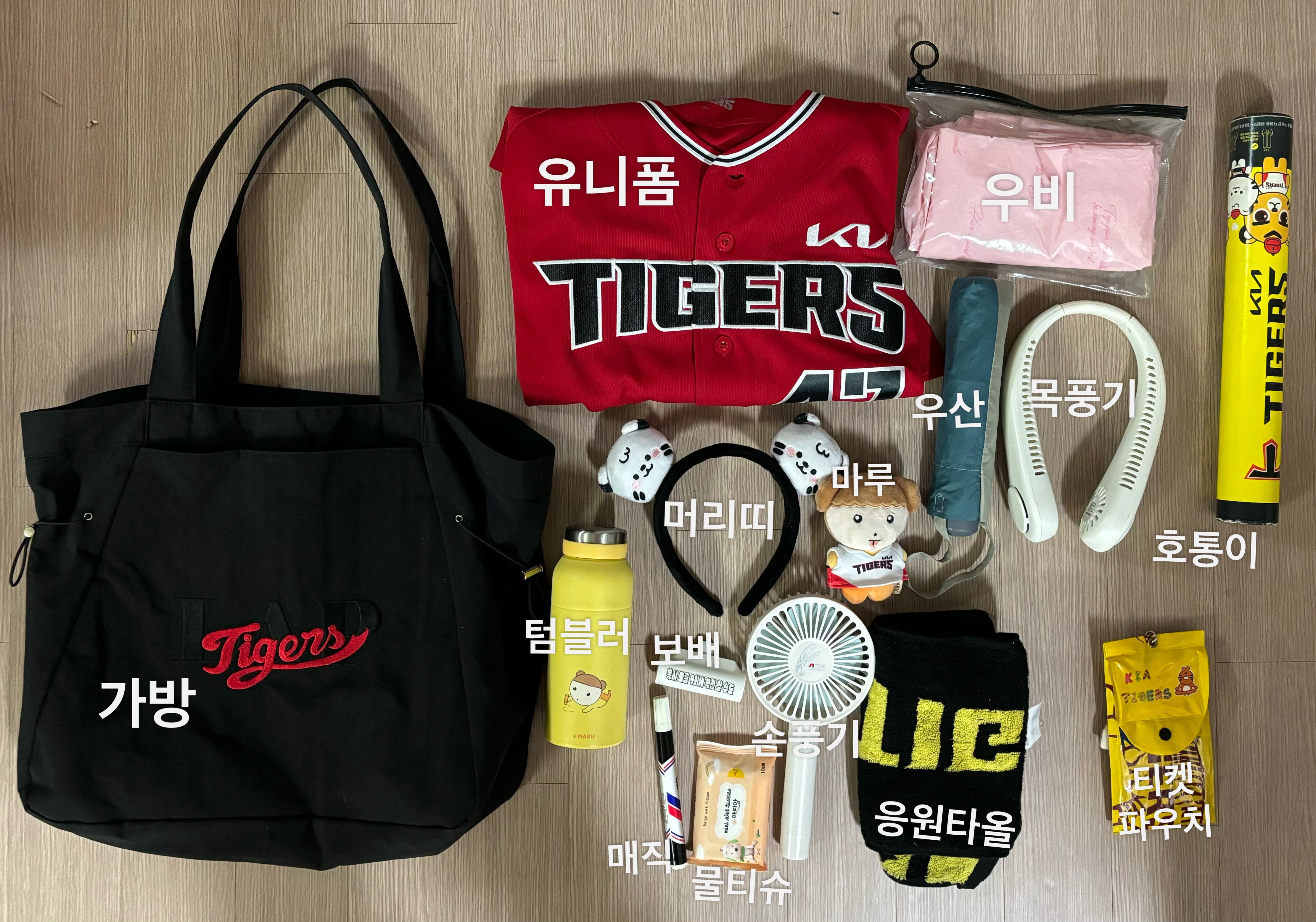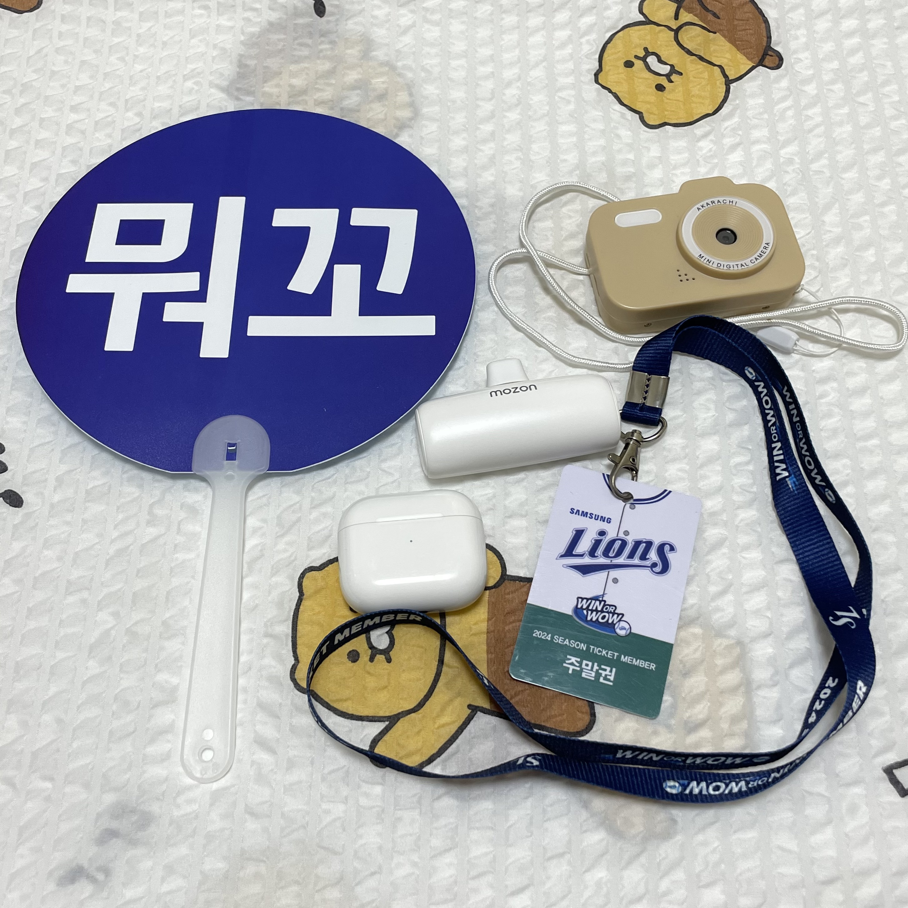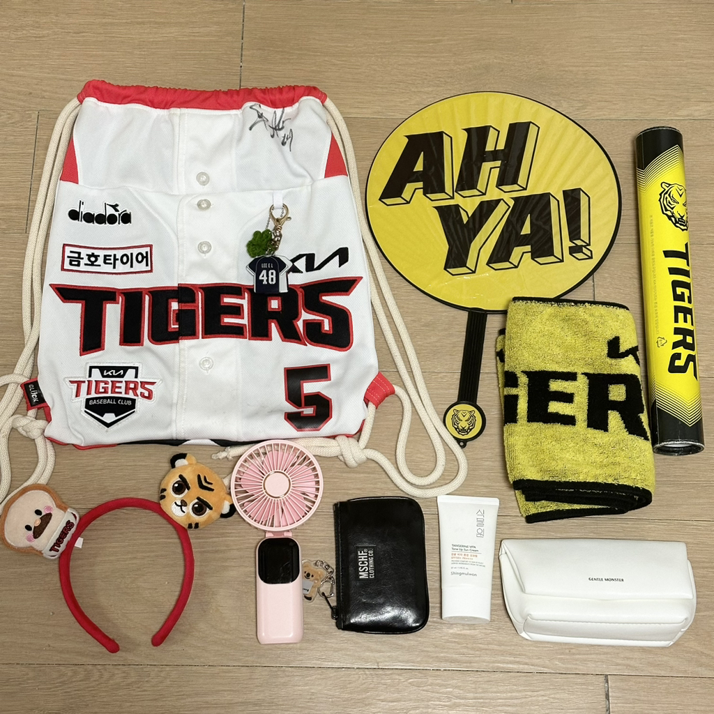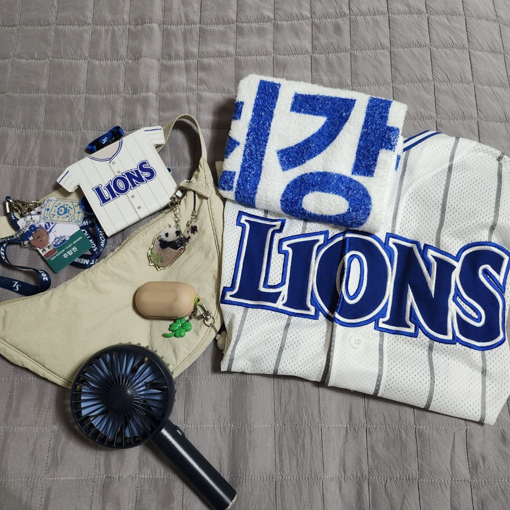 단 필수인 유니폼이랑 짝짝이를 챙기고 tmi로 유니폼 마킹은 제가 전자몽이기 때문에 전준우 선수 했어요. 사직가는 길에 노래가 없으면 안되서 이어폰이랑 무선 배터리를 꼭 챙겨요. 비상용 휴지랑 립밤, 요즘은 덥길래 방글이들 추천으로 손풍기도 들고 다녀요. 저 노란 파우치는 지갑 겸 작은 물건 넣는 용이고 거기에 달린 키링은 랜덤으로 뽑은 겁니다. 제가 고른거 아니예요.