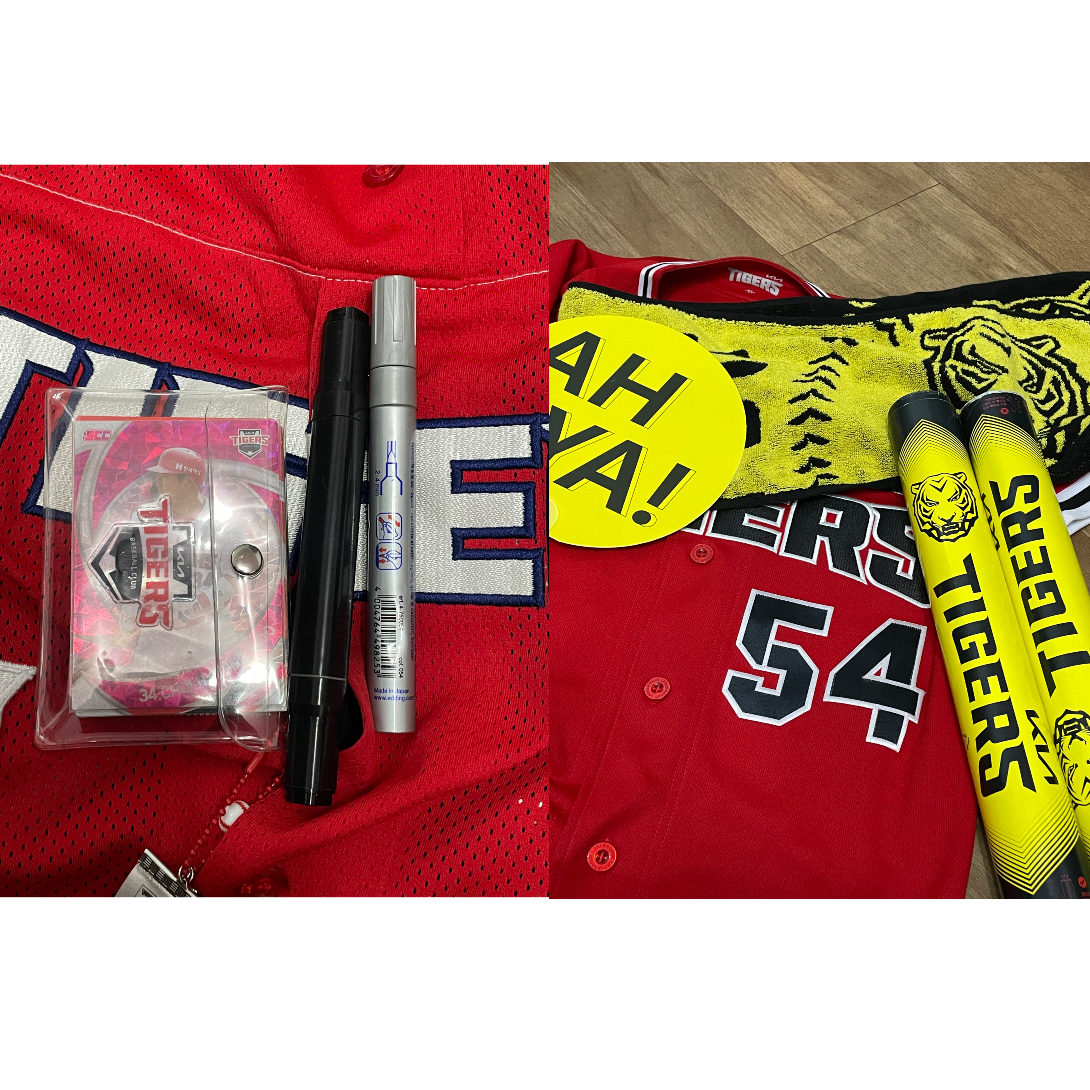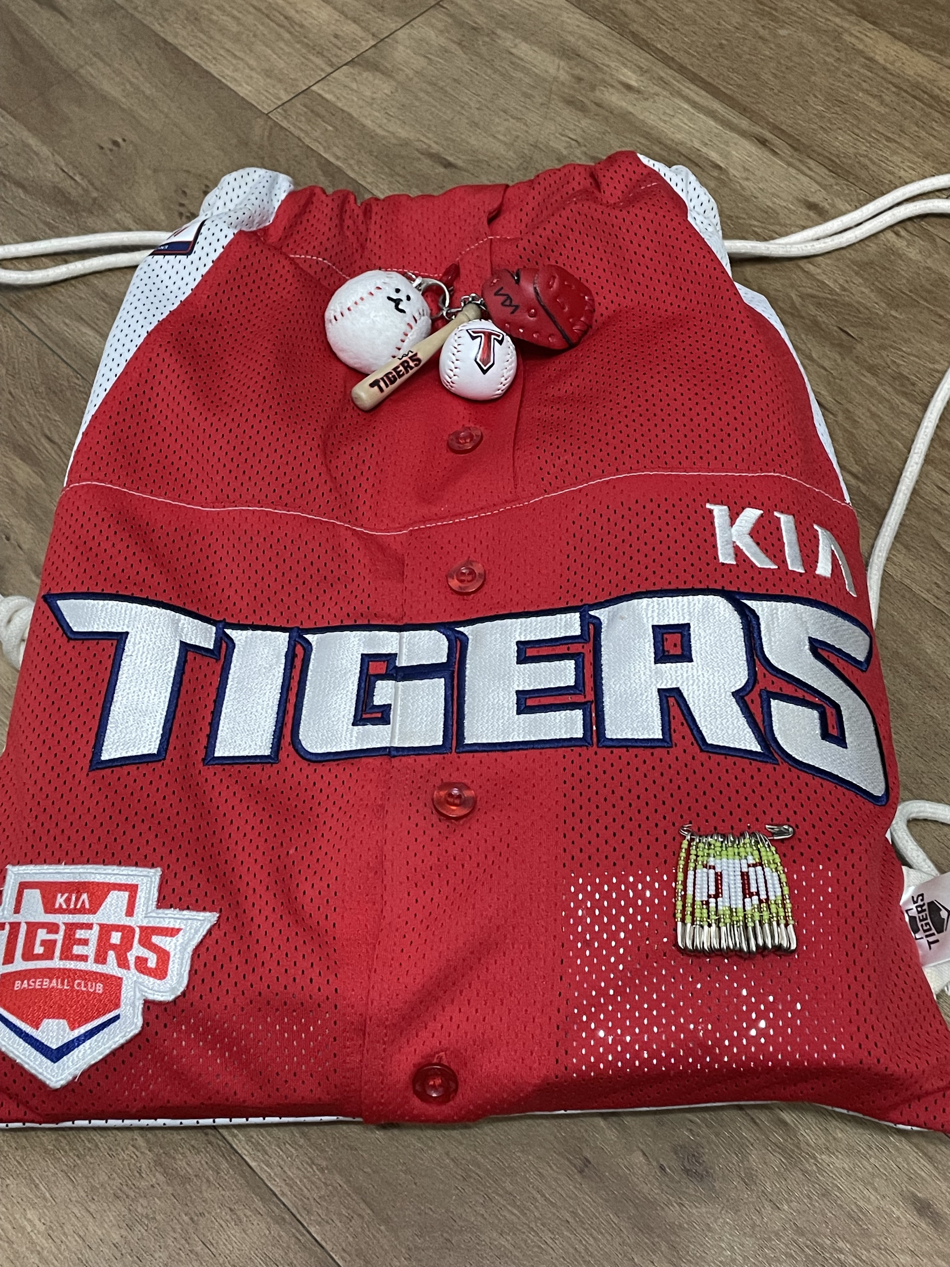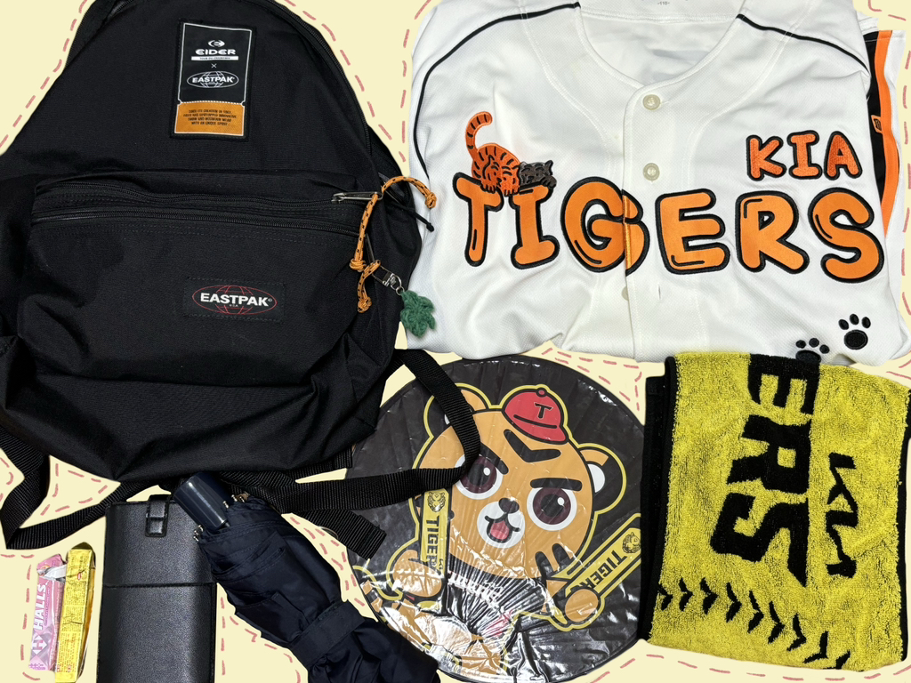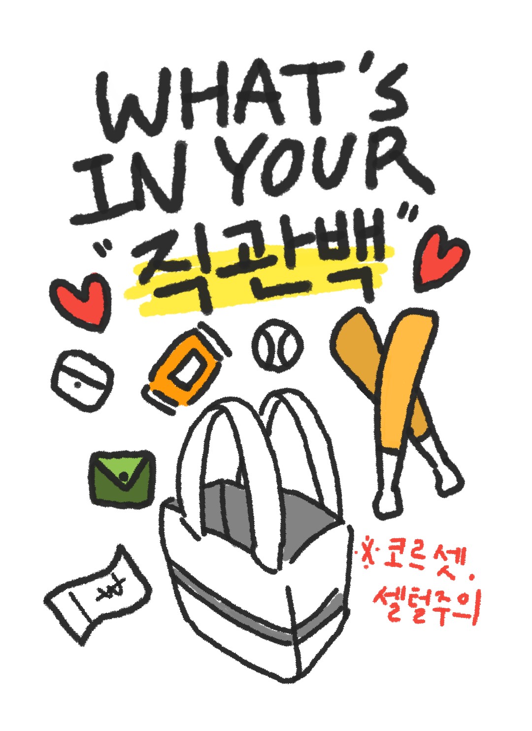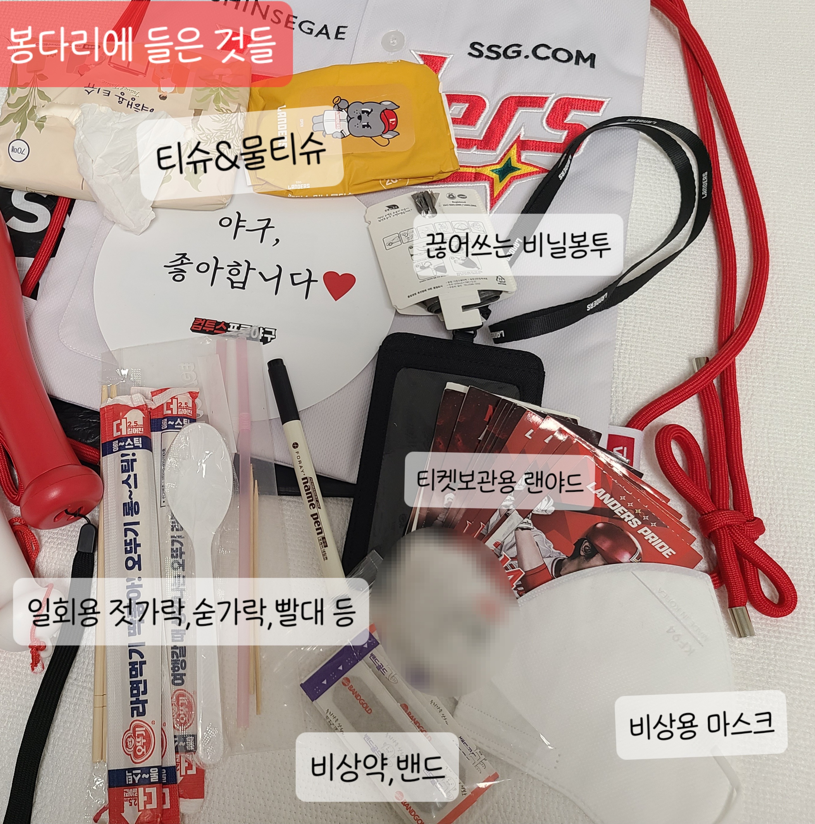 단 필수인 유니폼이랑 짝짝이를 챙기고 tmi로 유니폼 마킹은 제가 전자몽이기 때문에 전준우 선수 했어요. 사직가는 길에 노래가 없으면 안되서 이어폰이랑 무선 배터리를 꼭 챙겨요. 비상용 휴지랑 립밤, 요즘은 덥길래 방글이들 추천으로 손풍기도 들고 다녀요. 저 노란 파우치는 지갑 겸 작은 물건 넣는 용이고 거기에 달린 키링은 랜덤으로 뽑은 겁니다. 제가 고른거 아니예요.