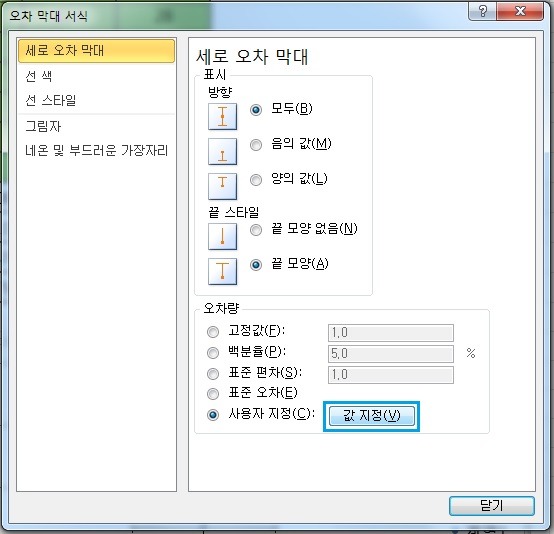 - 나오는 창에서 오차량 - 사용자 지정 - 값 지정 버튼을 누릅니다.