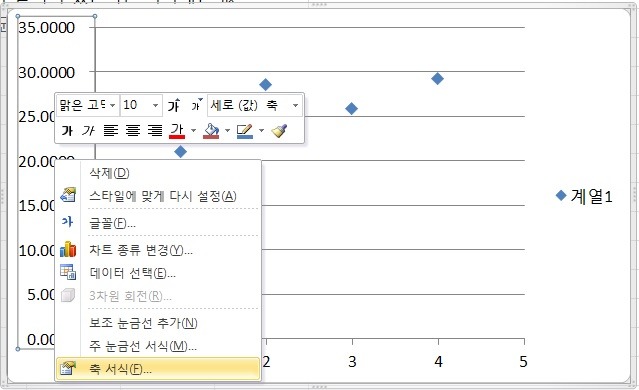 - 그래프의 왼쪽에 생성된 축을 마우스로 선택하고 오른쪽 클릭을 하여 축 서식을 선택합니다.