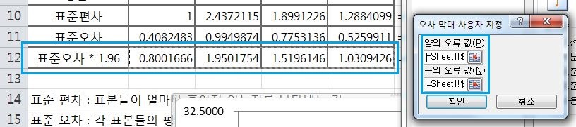 - 오차 막대 사용자 지정 창에서 양의 오류 값과 음의 오류 값을 모두 표준오차 * 1.96이 계산된 셀들을 선택합니다.