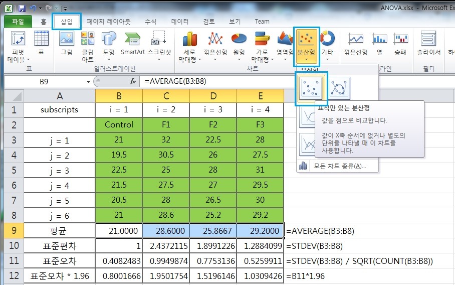 이전 글에서 에러바가 있는 barplot을 그려보았습니다. barplot은 엑셀의 오차 막대 옵션에서 표준오차를 사용하여 그렸는데요.