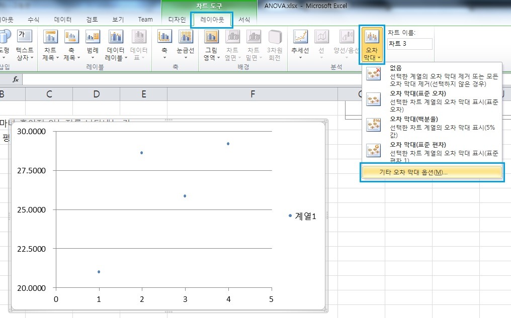 - 점의 모양이 바뀐 그래프를 마우스로 선택하고 엑셀 메뉴의 레이아웃 - 오차 막대 - 기타 오차 막대 옵션으로 들어갑니다.