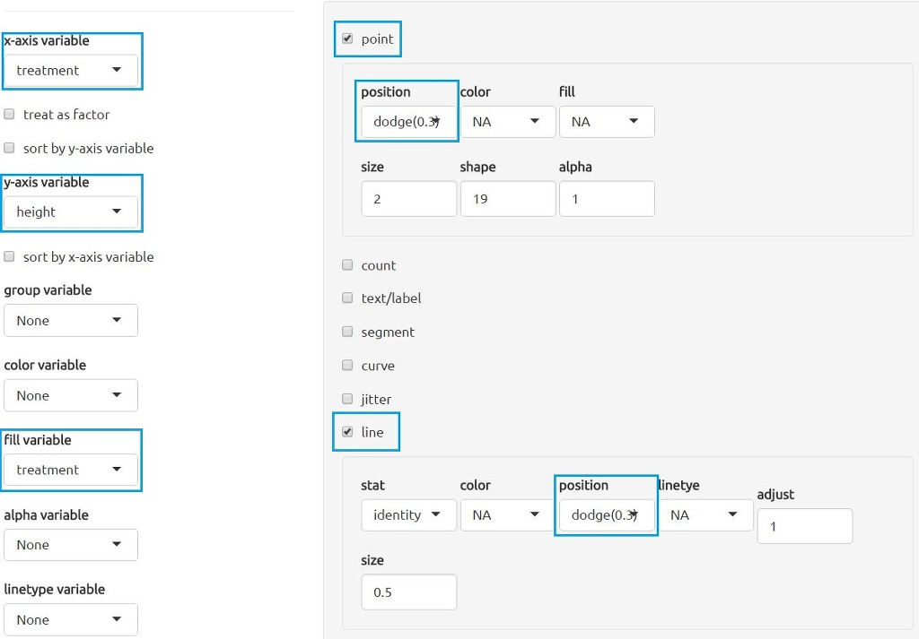 - 하단 옵션에서 위와 같이 선택을 해줍니다. 왼쪽을 먼저 설정해주고 오른쪽에서 point, line 체크 박스를 선택하고 파란색 박스 부분을 설정해줍니다.