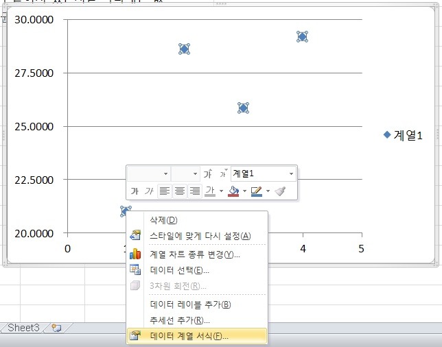 - 가로축을 재설정한 뒤 그래프의 점 하나를 마우스로 클릭하고 오른쪽 클릭하여 데이터 계열 서식 옵션으로 들어갑니다.