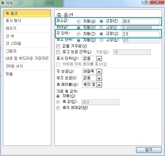 - 나오는 창에서 최소값과 주 단위를 재설정 해줍니다.