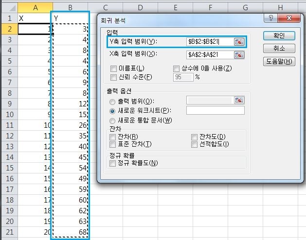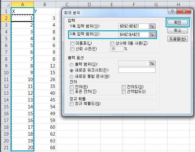 Y축, X축 입력 범위는 위와 같이 선택하고 확인을 누릅니다.