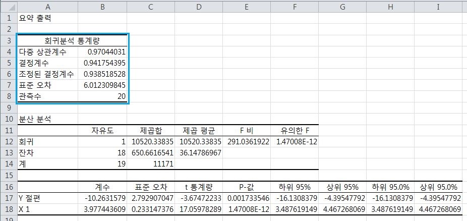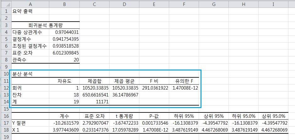 이 부분은 분산분석과 상관이 있는데 이를 위하여 먼저 SST, SSR, SSE의 자유도를 확인하여야 합니다. 엑셀을 통해서 먼저 해보겠습니다.