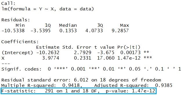 Rsquared의 값이 70% 이상으로 생성한 회귀모델이 유용하다고 하여도 이를 통계적으로 유의한지 확인할 필요가 있습니다.