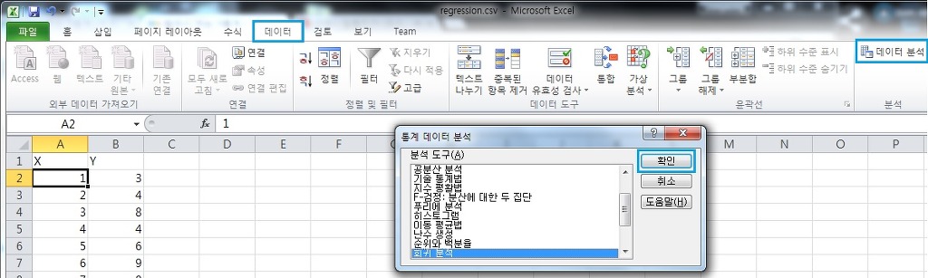 데이터가 입력되어 있는 엑셀 파일 메뉴의 데이터 - 데이터 분석 - 회귀분석을 선택하고 확인을 누릅니다.