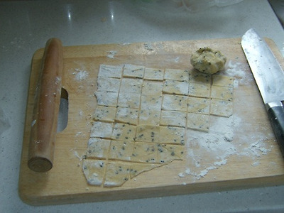 6. 30분 후, 꺼내서 밀가루 뿌리고 밀대로 밀어서 칼로 자르고,