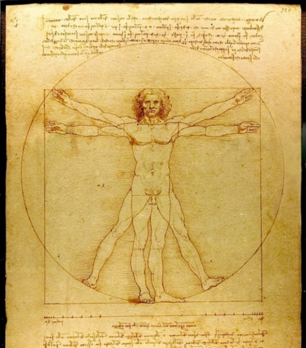 다빈치의 인체 그림 '비트루비우스적 인간'. 고대 로마 건축가 비트루비우스의 책에 나오는 이상적 인체 비율을 풍부한 해부학 연구 자료로 재구성했다. 아래는 각종 기계와 무기, 동물 스케치.