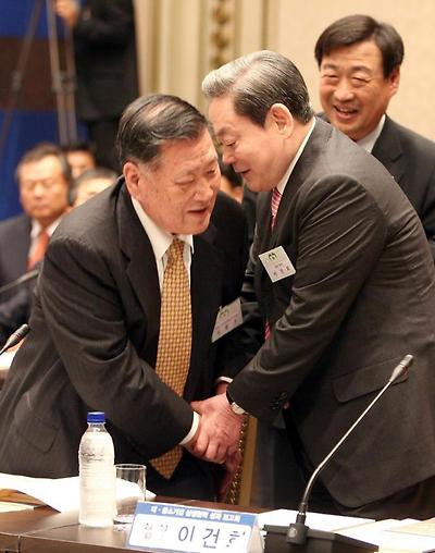 2007년 9월 청와대 영빈관에서 열린 대·중소기업 상생협력 성과보고회에 참석한 이건희(오른쪽) 삼성그룹 회장이 정몽구 현대차그룹 회장과 악수하며 이야기를 나누고 있다. 한국일보 자료사진