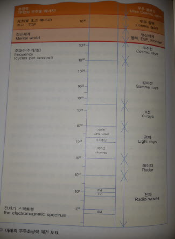 이는 오늘날의 과학이 밝혀놓은 빛(파장)의 단계에 대한 도식이 앞으로 어떻게 바뀌게 될지 예견한 것이다. 혹은 아직까지 밝혀지지 않은 이 ‘우주초광력’이라는 우주의 빛viit이 이 파장들 가운데서 어느 위치에 속하는지 밝혀두었다고 할 수 있다. 오백년이 될지 천년이 될지는 정확히 알 수 없지만 앞으로 몇 백 년 후의 과학은 전부는 아니더라도 상당부분 ‘우주초광력’을 인식하고 밝힐 정도의 수준에 이르게 될 것이다. 나는 다음의 예견 도표에서 보듯이 지금가지 과학이 밝혀낸 광선의 종류 중 가장 상위에 있는 광력(光力)을 초월하여 존재하는 것이 ‘우주초광력’이라고 본다. 이는 현재의 과학적 지식으로는 도저히 밝혀 낼 수 없지만 언젠가 밝혀지게 될 것이다.