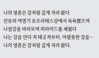 "나는 강을 알고 있다 / 나의 영혼은 강처럼 깊게 자라 왔다 / 인류의 여명기 유프라테스강에서 목욕했으며 / 콩고 강가 오두막에서 물 소리 자장가 삼았고 / 나일강을 바라보며 피라미드를 세웠다 /링컨이 뉴올리언스에 왔을 때 / 미시시피강의 뱃노래를 들었고 / 나는 흙탕물이 일몰속에 금빛으로 물드는 것을 보았다 / 나는 강을 안다 저 태곳적부터, 어렴풋한 강을… / 나의 영혼은 강처럼 깊게 자라 왔다."
