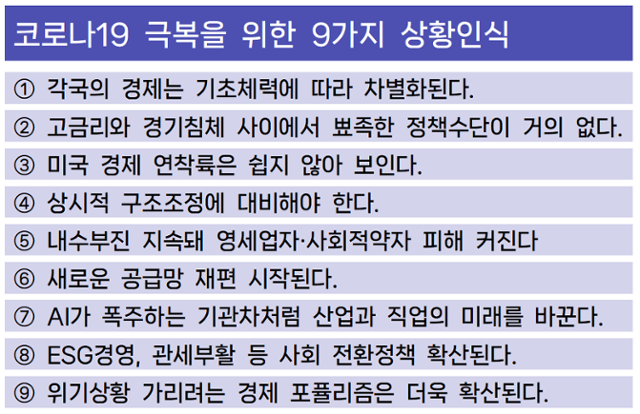 8. 사회 전환정책 확산: 코로나19로 가려졌던 전환형 정책들이 수면 위로 올라설 것이다. 글로벌 최저법인세, 관세의 부활, 기후 위기에 대한 규제가 더욱 빨라질 것이다. ESG 경영도 다시 확산될 가능성이 높다. 독과점 빅테크 기업들은 양극화와 내수 침체로 다양한 형태의 규제가 예상된다.