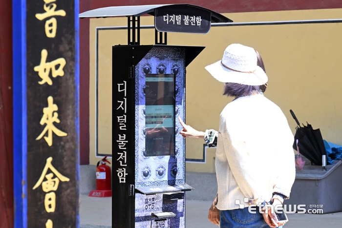 .부처님오신날을 앞두고 키오스크를 통해 간편하고 쉽게 시주를 할 수 있는 '디지털 불전함'이 눈길을 끌고 있다. 13일 경기 남양주 봉선사에서 불자들이 디지털불전함 키오스크를 통해 시주를 하고 있다.