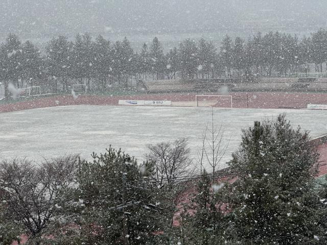 27일 낮 12시 강원 화천 일대에 올가을 첫눈이 내리는 가운데 화천생활체육공원에 눈이 쌓이고 있다. 뉴스1