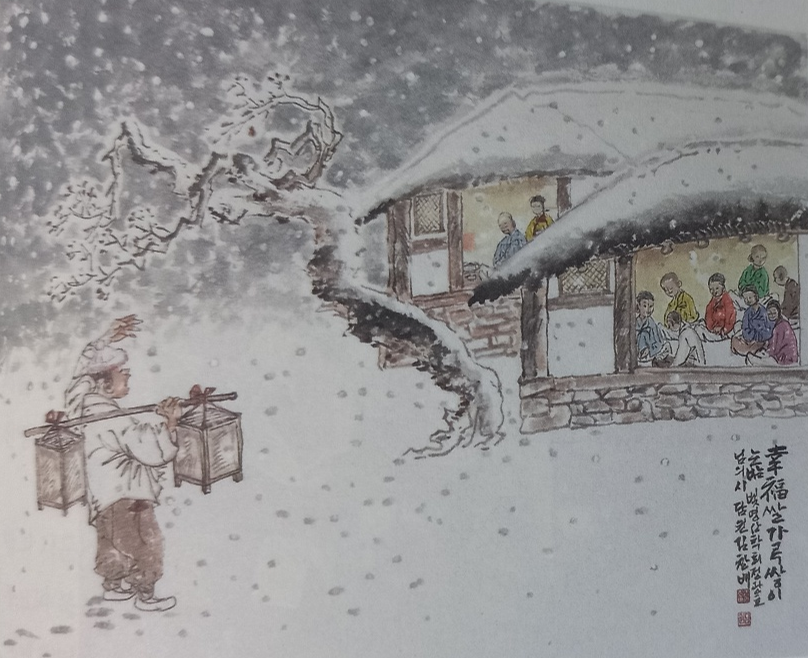 눈이 소복 이 쌓인 물지게를 진 망개떡 할배를
