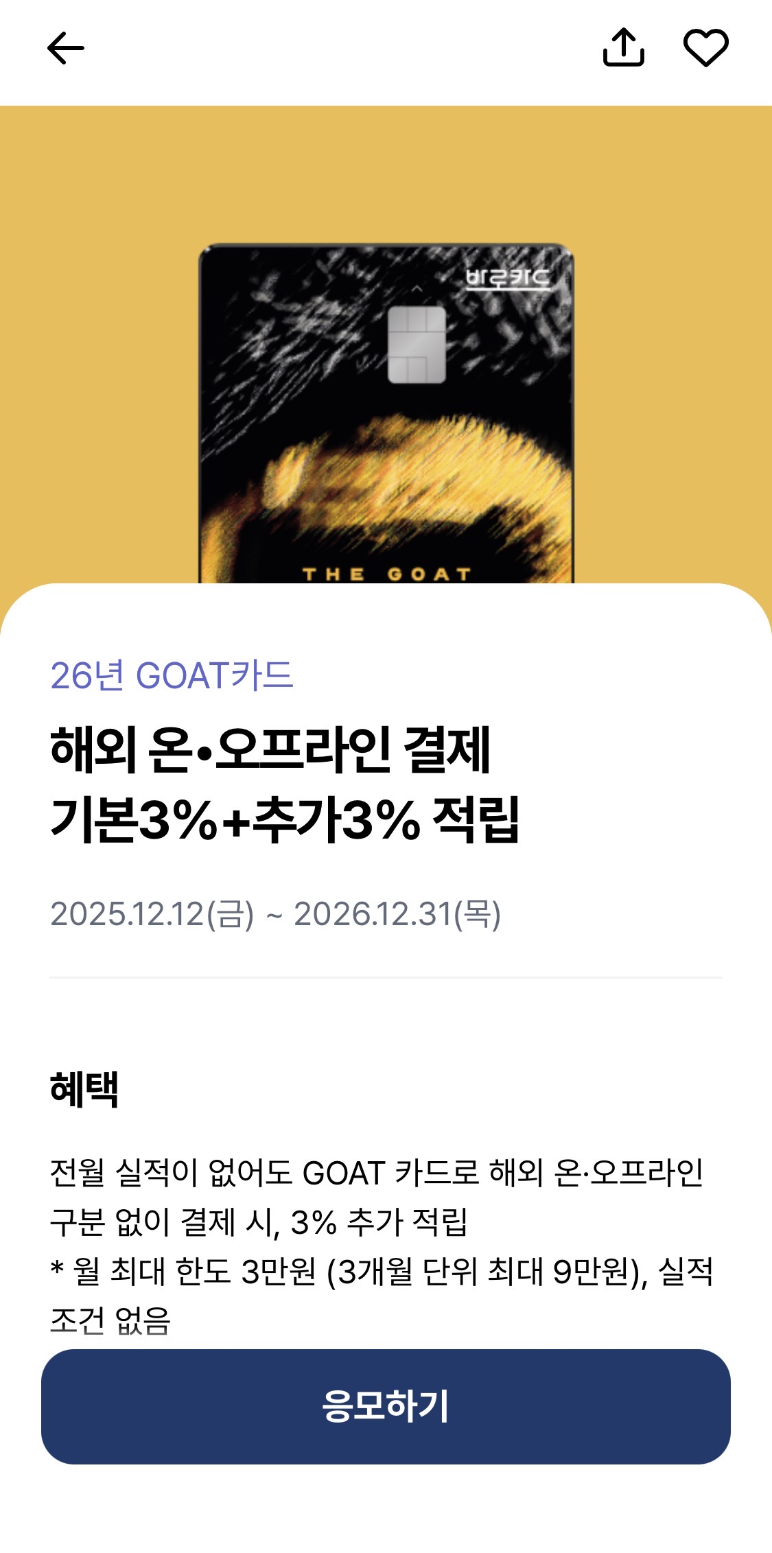 일전에도 한번 해외직구나 해외여행용으로 BC 바로 GOAT카드 내용 공유드렸었는데- 2026년엔 아예 1월부터 12월까지 연중으로 3% 추가 적립 이벤트가 오픈됬어요!!! (해외 결제 쓸일 많은 저희들에겐 베스트 ㅠㅠ) 한 번 보시고 이용해 보시면 좋을 것 같아요! (월 최대 3만원까지 추가적립..!)