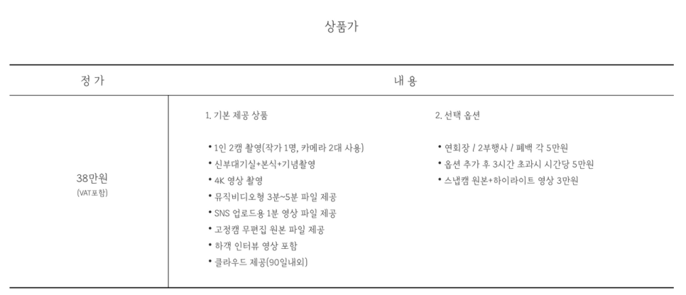 보통 캠이 1캠에서 2캠으로 가는순간, 그리고 영상 화질이 4K로 변하는 순간 추가금이 붙더라구요ㅜㅜ 르랑필름은 추가금 없이 구성품에 포함되어 있어 그게 너무 좋았습니다. 또한 부가세포함!! 하여 38만원!!!