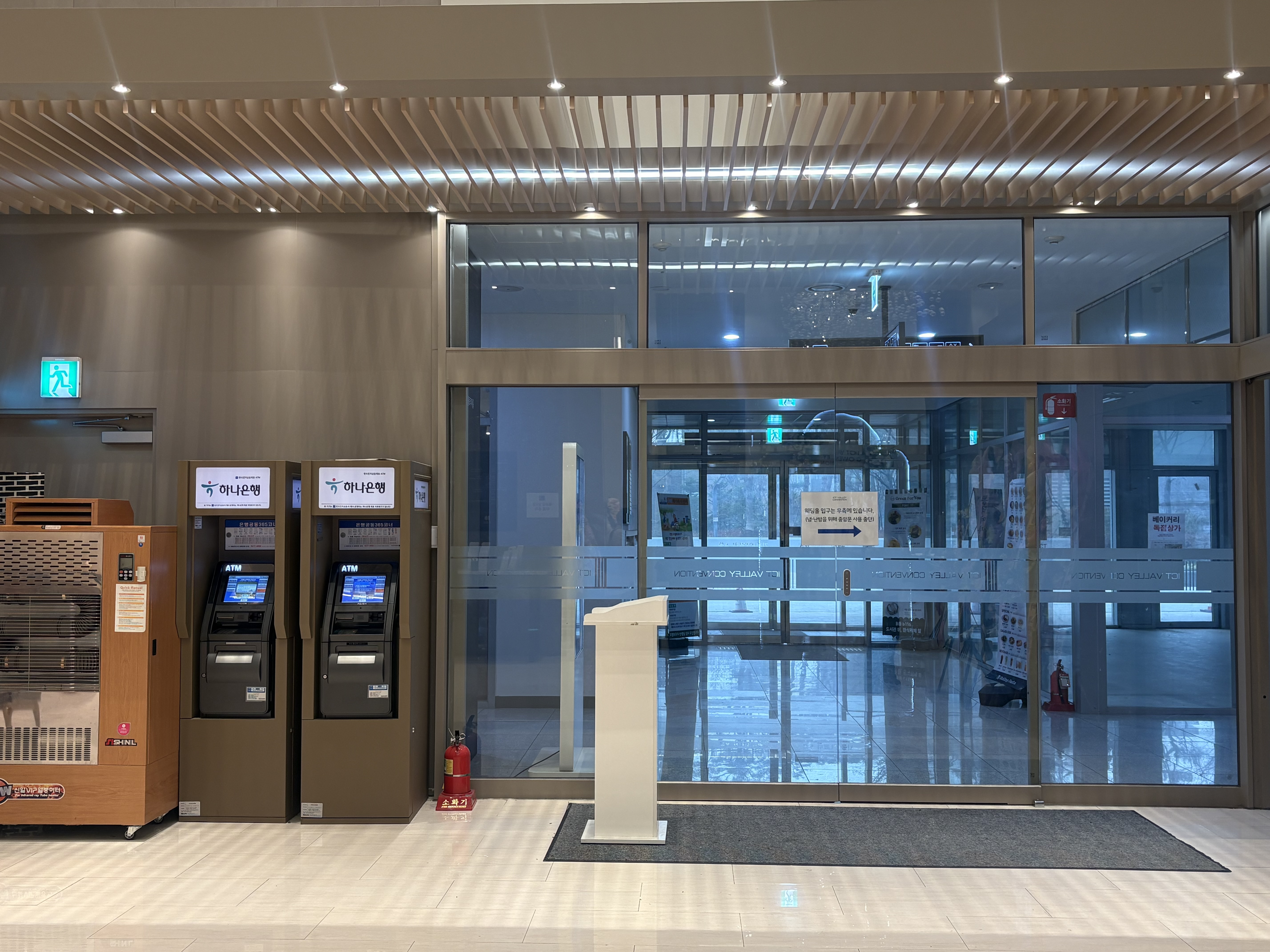 입구 쪽에 예식 하시는 신랑, 신부의 리스트가 적혀있는 기기가 있고, 안쪽에 두 대의 atm 기기가 있어요!