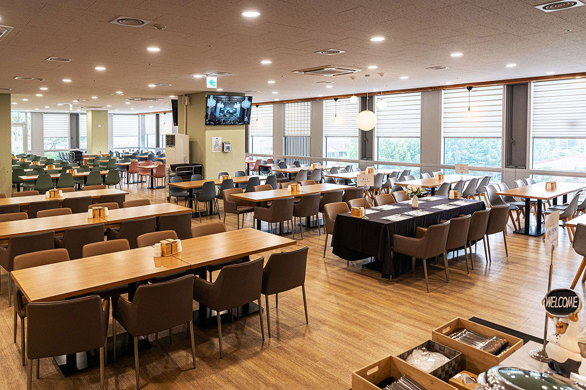그리고 단상의 전동 커튼에 빔프로젝터를 쐬서 식전 영상이나 식중 영상을 틀어주셨었는데, 내년에는 LED스크린으로 변경 예정이라고 합니다.
